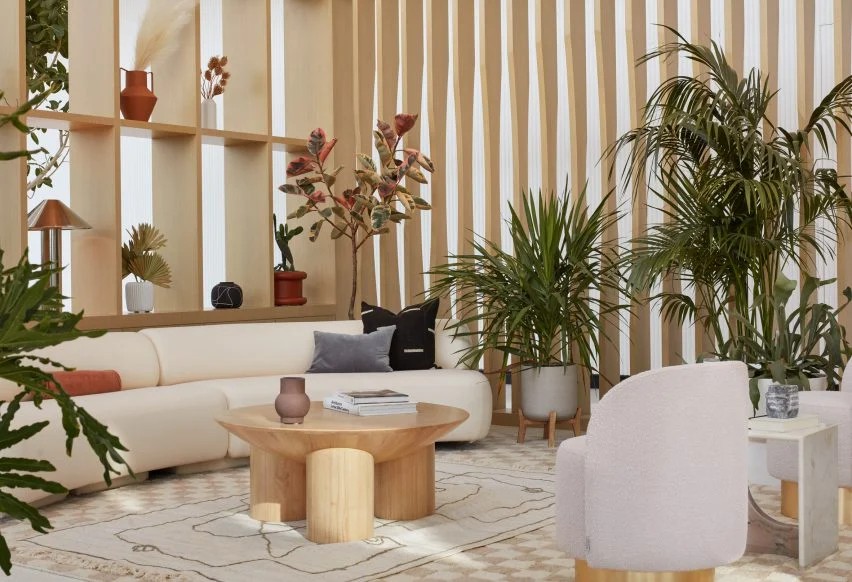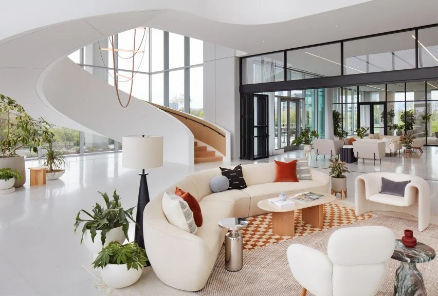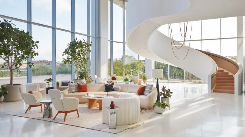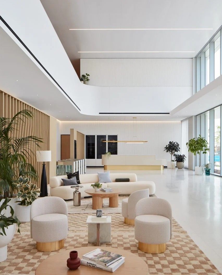 在通高的大厅里,纯白色的内饰被黄铜和柔和的中性色调家具所温暖。几个座位区包括舒适的沙发和重点椅子,布置在大型纹理地毯上,点缀着植物。垂直的木制百叶窗和架子为这些休息室提供了背景,创造了一个看起来更像酒店大堂而不是科学中心的场景。