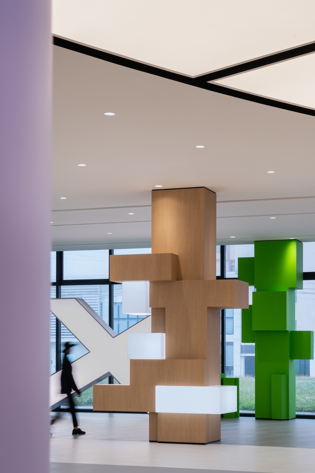 中庭是一个下沉式的咖啡区,中空是圆形的挑空空间,也是整个建筑中央部分,阳光从顶上的采光井透下来,三五友人在此喝咖啡好生惬意,咖啡服务台也是以像素模块化为概念基础,但更加年轻化和充满色彩感。中庭的环形车道从一层缓缓环绕到二层,环形车梯天井的设计,在增加自然采光的同时,于建筑内部形成风自外而内贯穿循环,促进室内空气对流,从而散热降温,有效改善了建筑环境的微气候。