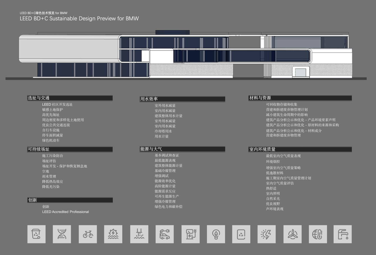 基于可持续的设计思考,还采用了一系列可持续发展的设计策略,包括从围护结构的热工性能,到建筑自遮阳系统、自行车及更衣淋浴设施、新风监测系统、高效冷热源系统等,再到建筑亮化及室内智能照明控制等的建筑能源计量、高效景观灌溉节水……直至施工污染防治等每个得分项细节,以及室内展车区和办公区的大部分采用了可拆卸的隔断形式、模块化的工作台等,大大减少了能源消耗,并增强了建筑的可持续性。