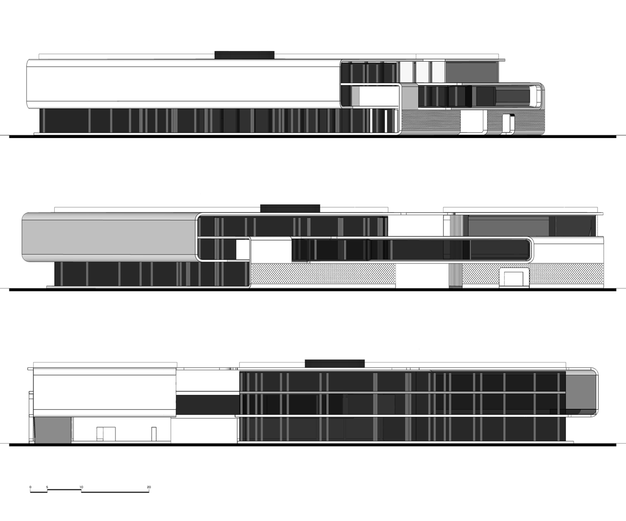 建筑的每个面都有出入口,宏观层面看,南边是展车区、办公室,停车场……共三层,北边是车间。南边展车区包含了一层的汽车展厅,和部分客户洽谈区、办公区;二层则集合了客户休息区、互动区、餐厅、茶室、咖啡厅、书吧、儿童游乐区、办公区于一体;三层主要以办公区和停车区为主。连廊贯穿南北建筑,北边三层都是维修车间,车间后有一个跑道,车可以直接开到屋面。