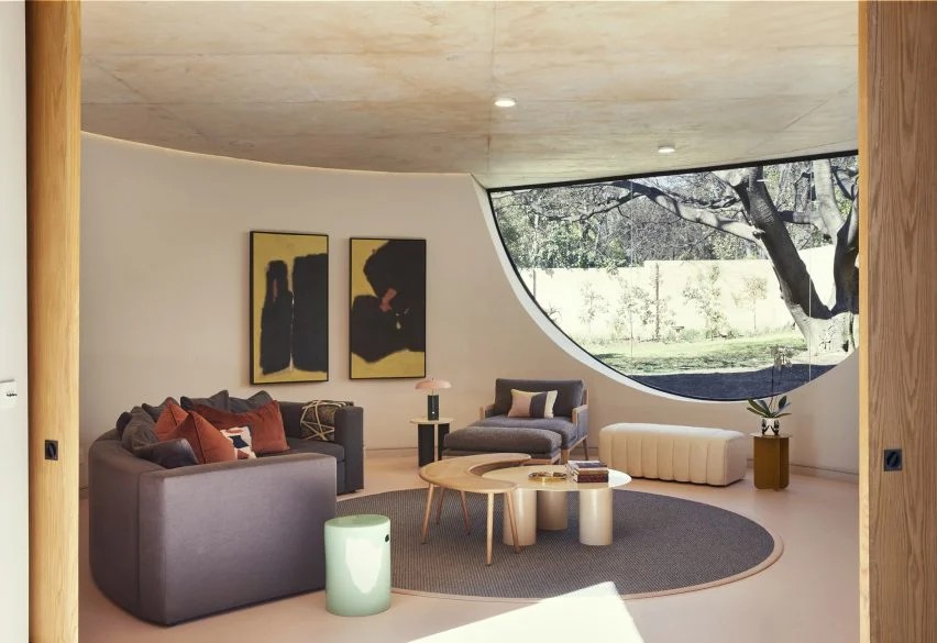 在东面,一个椭圆形的游泳池被花园露台包裹着,露台连接着铺砌的小路,这些小路环绕着住宅的两侧,连接着各种形式的建筑。建筑师格里戈里-卡茨说,“伟大的初级形状的房子”的内部设计是与室内设计师塞西尔—卡梅伦(Cecil Cameron)合作完成的,他希望带来一种“温暖和舒适”的感觉,与裸露的砖和混凝土外部形成对比,