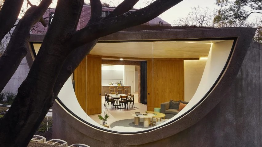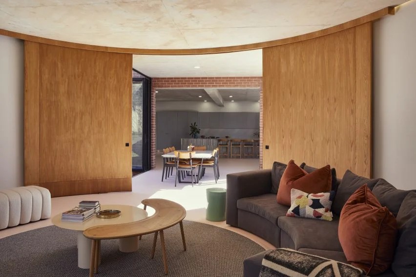 在起居区,通高的滑动木门兼作墙面覆盖物,而天花板边缘的嵌入式照明则强调了房间的圆形形式。在楼上,一层灰色的窗帘给主卧室带来了亲密的感觉,定制的家具适合室内不同寻常的形状。