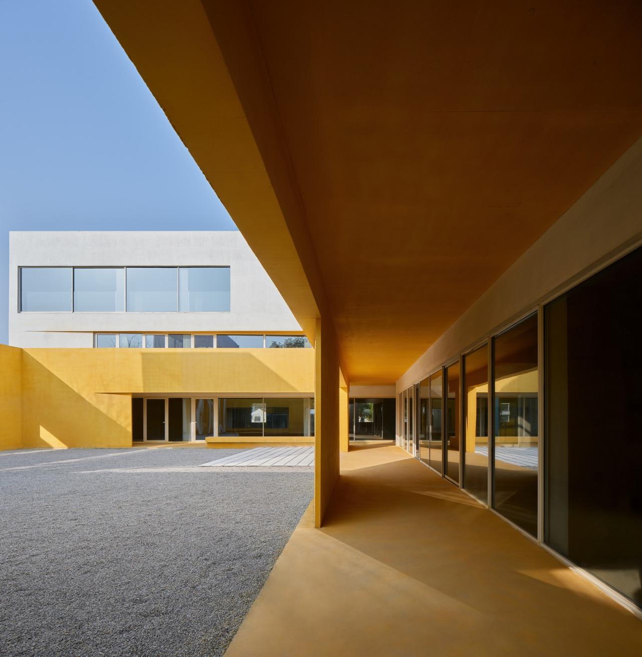 村庄建筑的传统赋予了主体建筑的白。田野中油菜花与稻谷的颜色赋予了廊与桥的黄。黄色的廊与桥起伏交错的穿插在白色的建筑之间,形成“q”字形的结构。不断变化的视角与空间体验让村落与田野的相遇更加富有戏剧性。