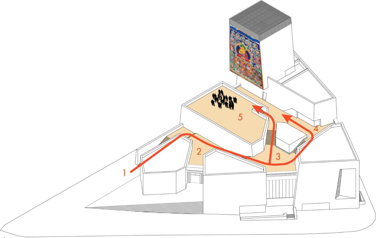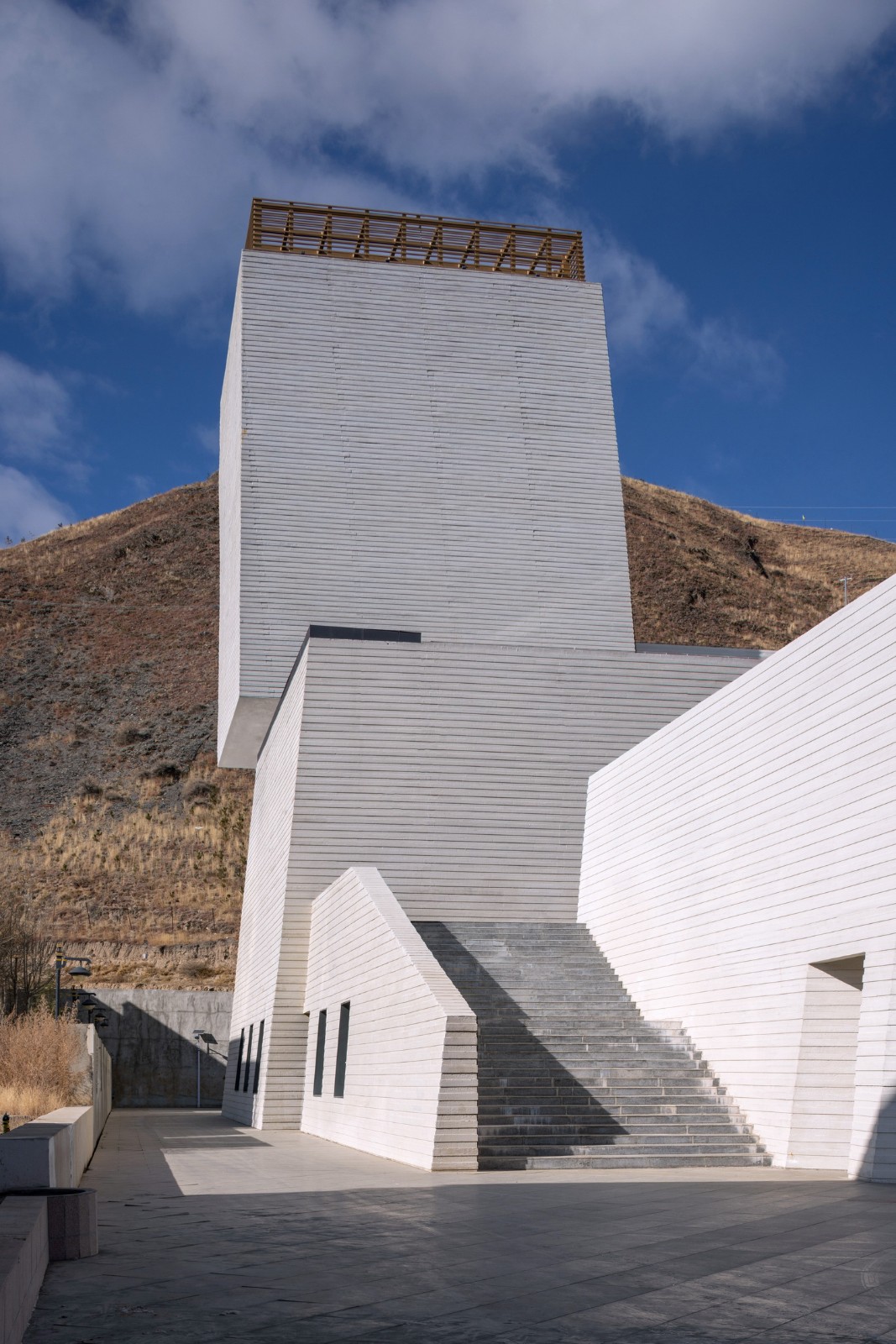 我们设计了室内外两条参观流线。“山“对当地居民有很深的精神引导意义。因此,在外部参观路线中,游客在不同体块间形成的高低错落的平台上拾级而上,可以欣赏悬挂在塔上的大型唐卡。主塔还具有"风塔 "的功能,双扇形的幕墙系统使塔楼内部气候可控,并可以提供自然通风。