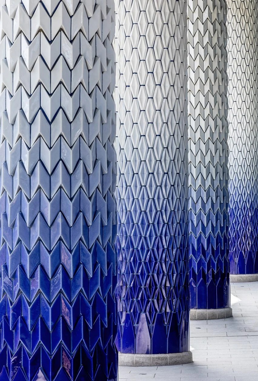 HTA设计公司说:“中世纪现代主义风格的重复创造了一个引人注目的新几何地标,由于塔楼底部、中间和顶部瓷砖的不同配置,建筑的外观随着高度的变化而微妙地演变。”为了创造一个视觉上吸引人的街道景观,连接现有的人行道,建筑底部的一系列7米高的柱子上覆盖着14,000块釉面瓷砖,由设计师亚当-拉萨尼尔-弗曼(Adam Nathaniel Furman)设计建筑的瓷砖具有三维的雪佛龙和钻石形状,并创造了从底部的蓝色到顶部的白色的渐变。