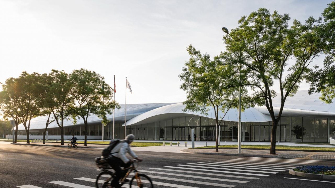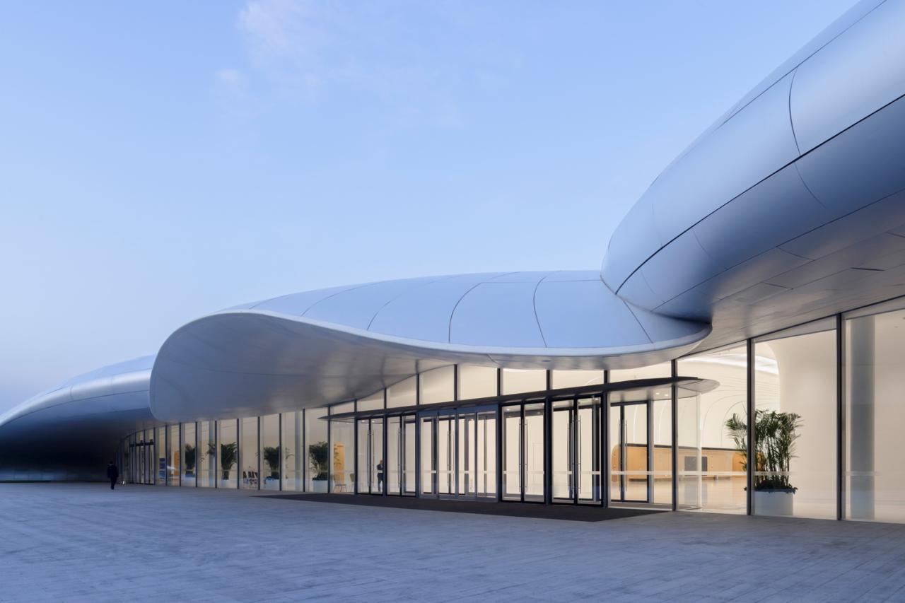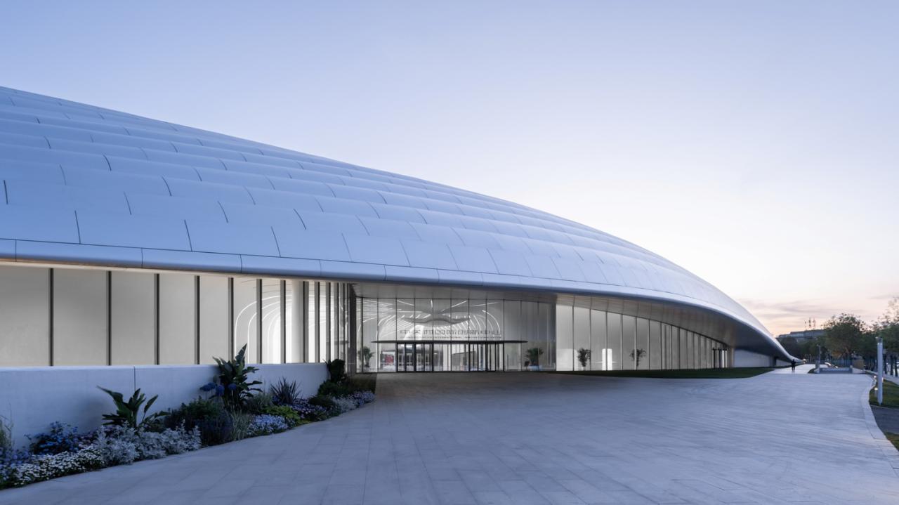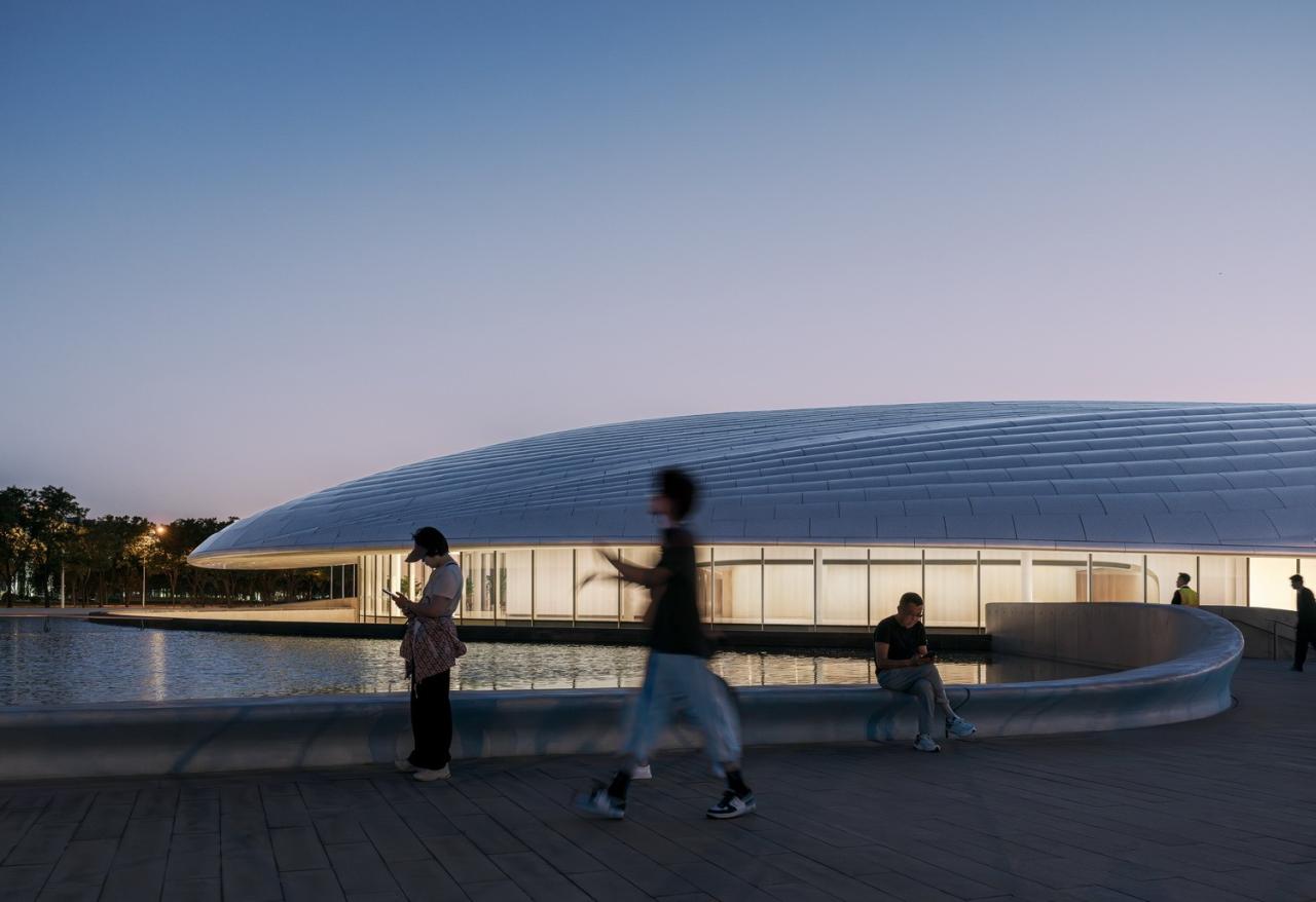 2769块形状、曲率各不相同的氟碳喷涂双曲蜂窝铝板,以“下搭上”的形式排布于屋顶的异形钢结构之上,形成疏密有致的银白色百叶,也有利于隐藏构造、收集雨水。夜晚,隐匿于屋面百叶板缝间的灯光与屋面线条同步舒展,动静相宜、相映成趣,既呼应着城市主干道川流不息的车流,也为城市增添了活力与动力。