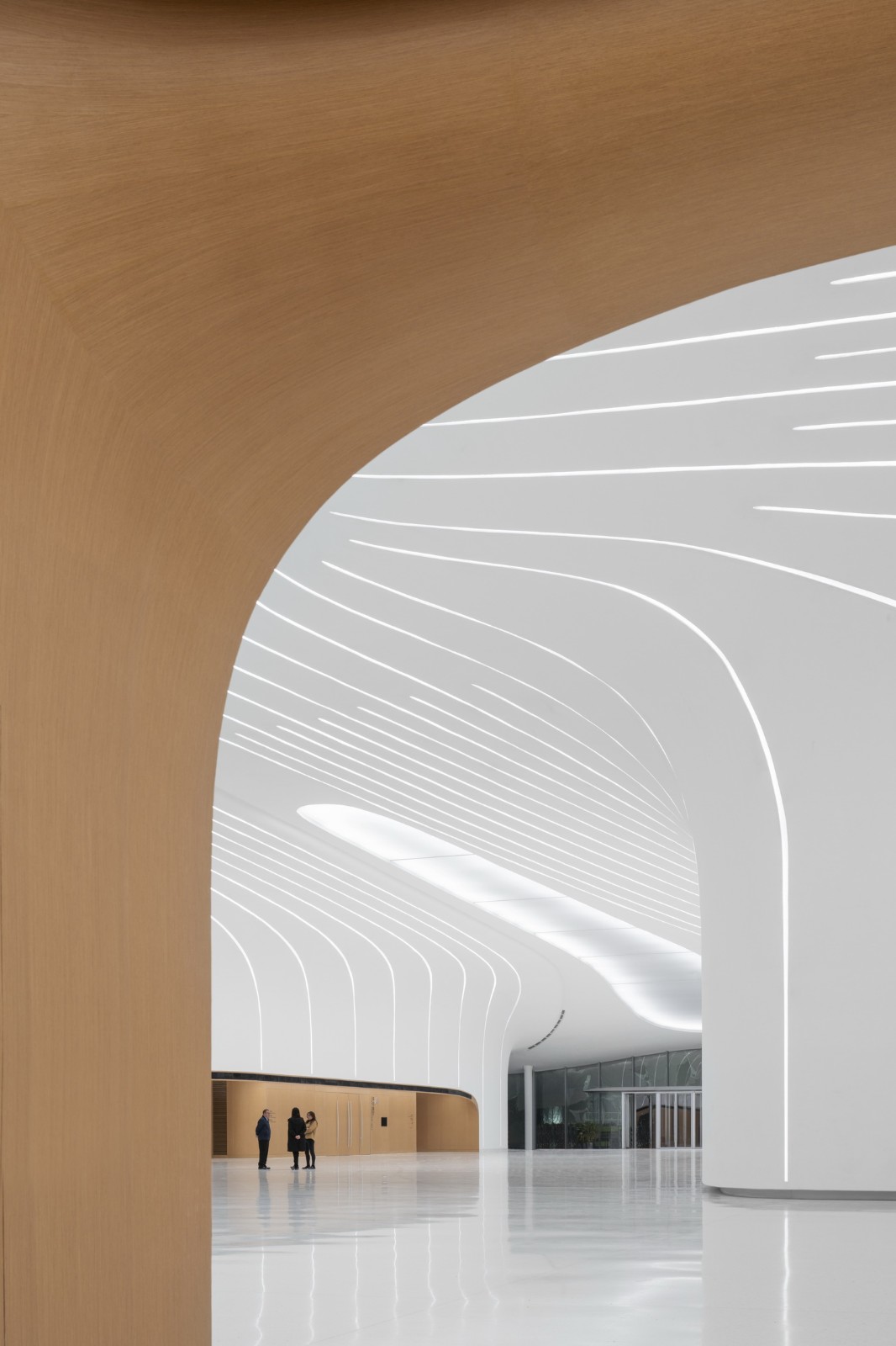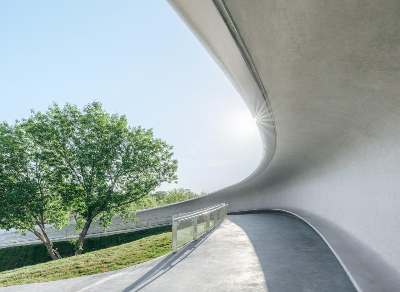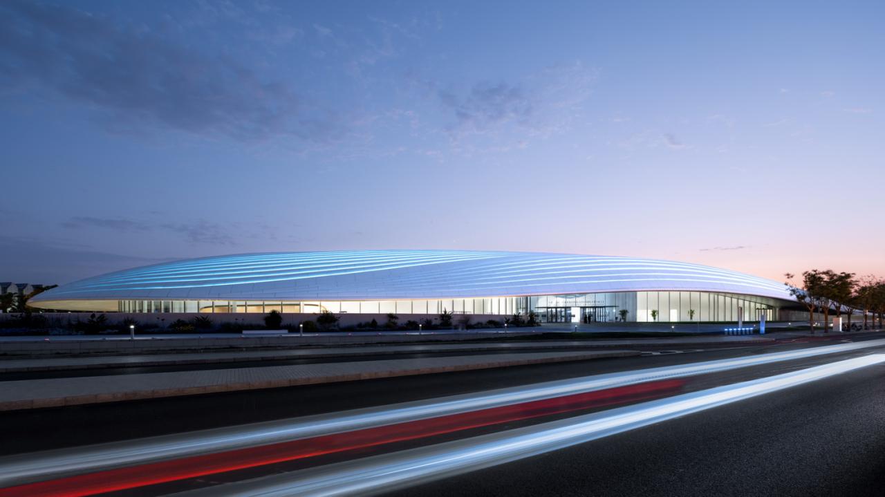 2769块形状、曲率各不相同的氟碳喷涂双曲蜂窝铝板,以“下搭上”的形式排布于屋顶的异形钢结构之上,形成疏密有致的银白色百叶,也有利于隐藏构造、收集雨水。夜晚,隐匿于屋面百叶板缝间的灯光与屋面线条同步舒展,动静相宜、相映成趣,既呼应着城市主干道川流不息的车流,也为城市增添了活力与动力。