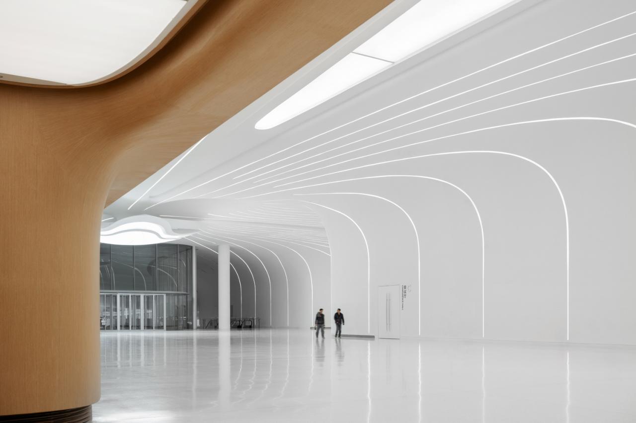 照明设计创新性地让可调节色温的室内灯光沿着建筑结构律动。灯光汇聚于中央飞行器,既为室内营造了不同的科技氛围,也打造了一处极具观赏性的空间装置艺术品。