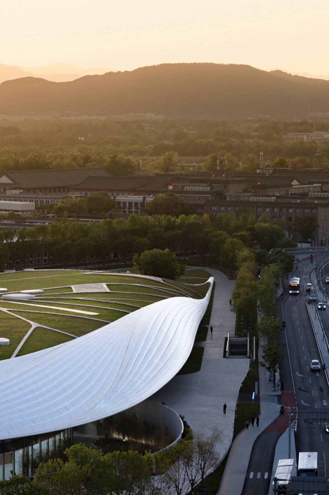 建筑的形态在大地上由北向南缓缓舒展。从不远处的三山向会址方向远眺,建筑体量完全消隐于城市中,绿色屋面以含蓄谦逊的姿态融入五园三山环境中,成为其在城市内的绿色延伸,也成为都市中难得的大地景观。