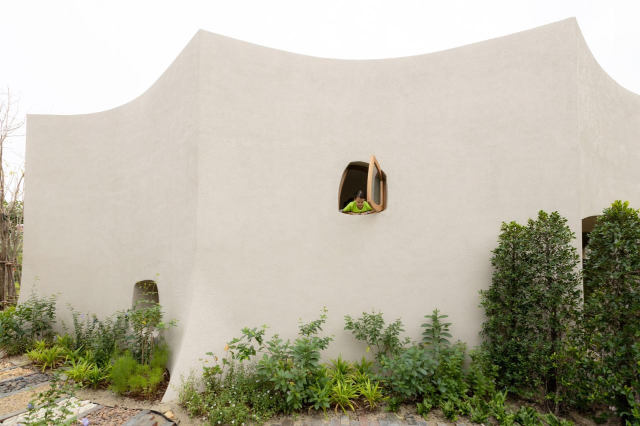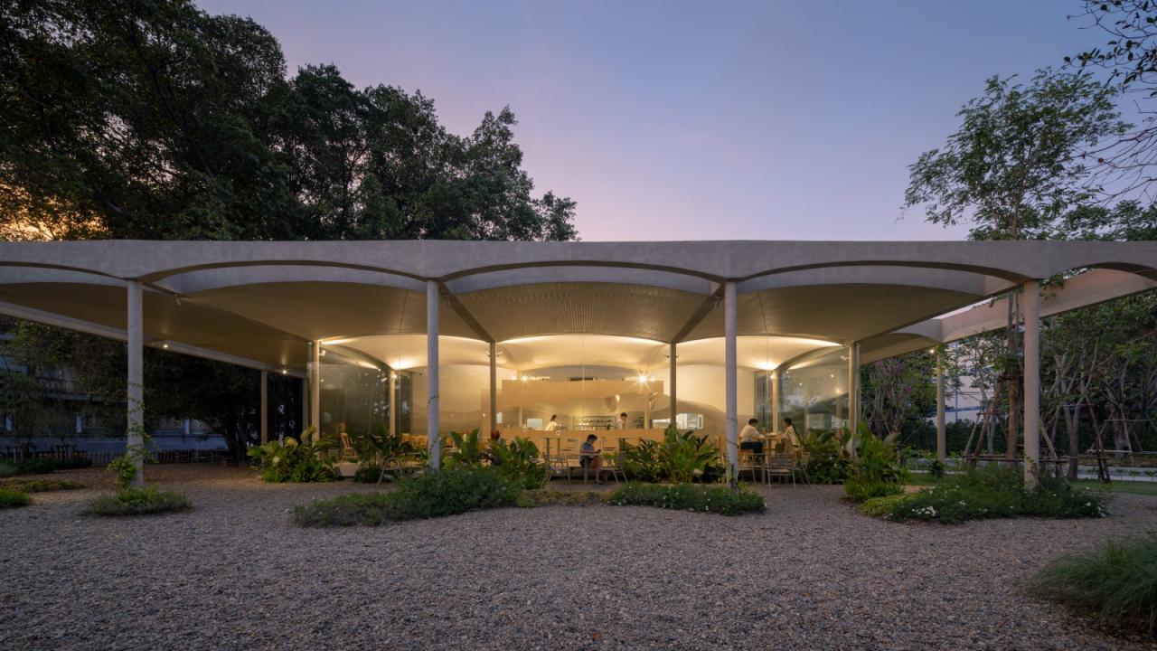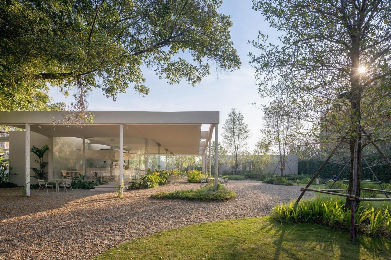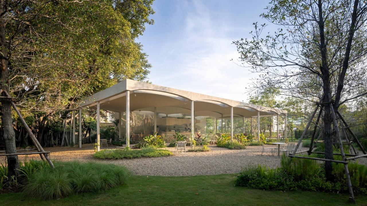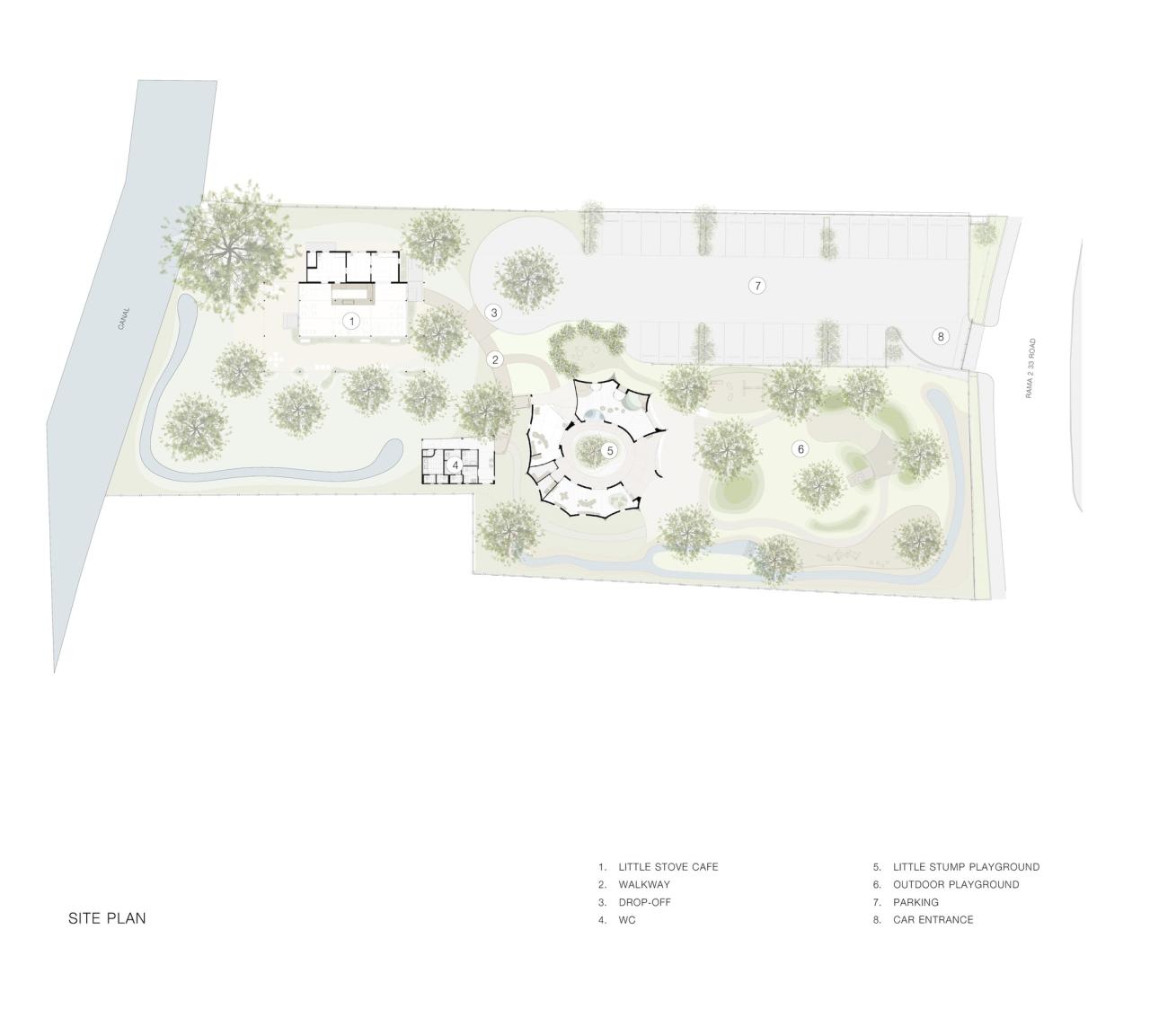 小火炉&小树桩是一家面包/咖啡店,以及一个室内和室外的游乐场,坐落在曼谷郊区一块4600平方米的土地上,毗邻运河。从一条最初被称为“Soi Wat Yai Rom”的小巷进入该场地,在泰语中,这条小巷被称为祖母伞庙巷。泰语单词“Rom”是伞和遮蔽区的同音词。这两种含义成为该复合建筑设计语言的灵感来源。咖啡店和游乐场共享一个落客区,连接人行道,38个停车位,以及一个独立的洗手间小屋。