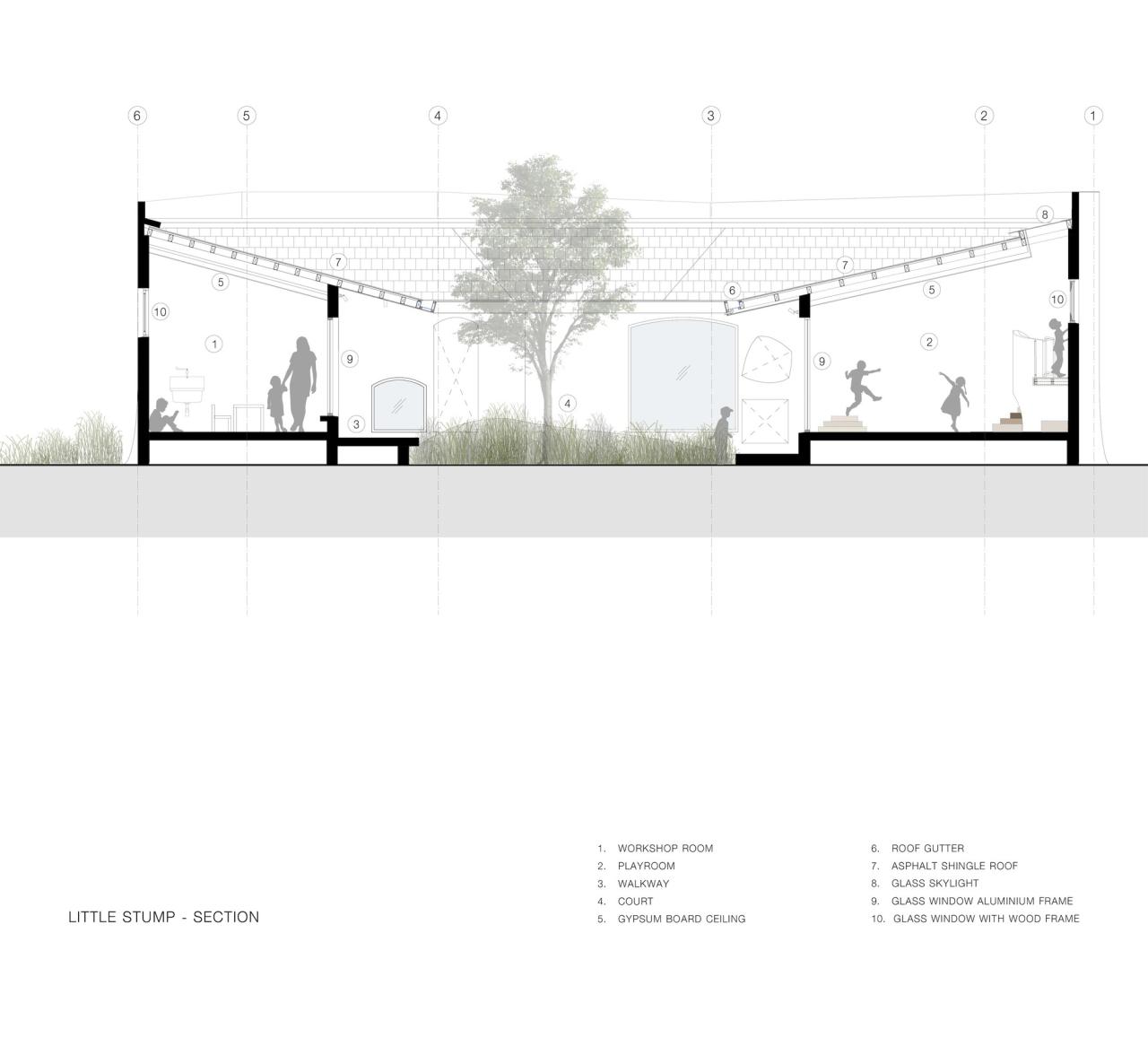 小树桩:其灵感来自一个空心的树桩,它是几个小动物的临时避难所,该建筑是书中叙述的完整写照,呼吁公众努力修复、填充和组装不完整的庇护所。建筑物设有一个中心庭院,象征生长和生命。通过参考自然的有机形状和形式,建筑柱子被转化为树干的简化形状。窗户开口形状就像树洞。这些设计与儿童扭曲的线条图形一起。建筑物的曲面幕墙和屋顶线被调整和简化以方便施工。小窗户、小椅子、桌子和凳子都是为我们的用户精心挑选的。