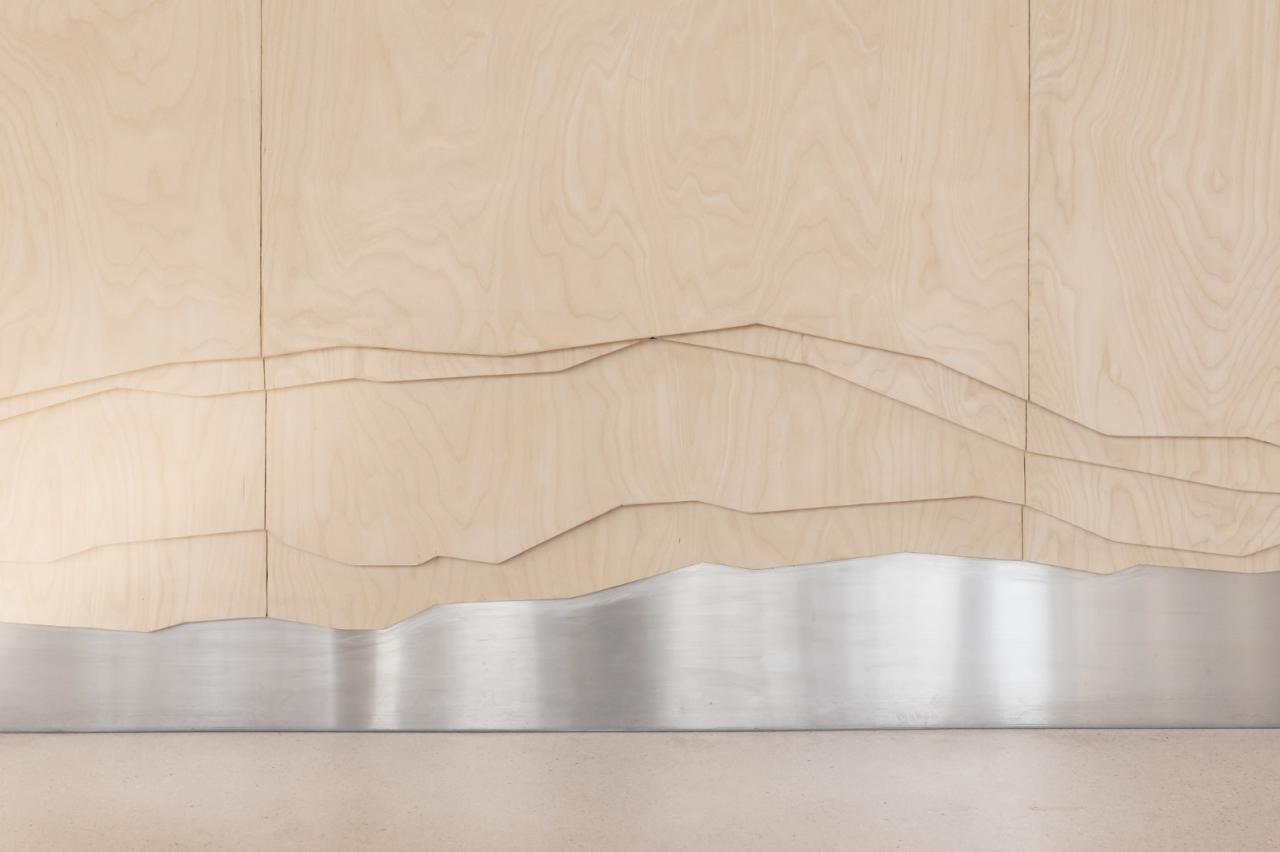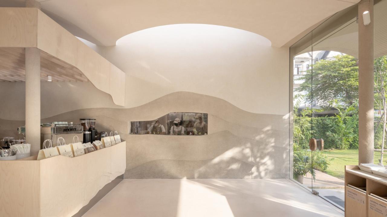 天窗是天花板曲面的椭圆形切口。这些孔为室内带来自然光,并突显手绘分层水磨石。主内墙将主座位区和展示柜台与服务厨房和烘焙室分开。展示柜台居中并与3个玻璃幕墙对齐,使室内和室外座位区都能获得广角视野。