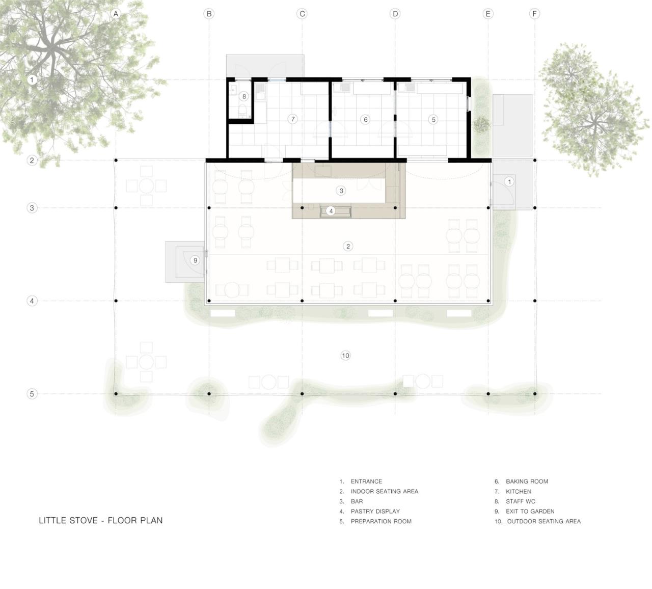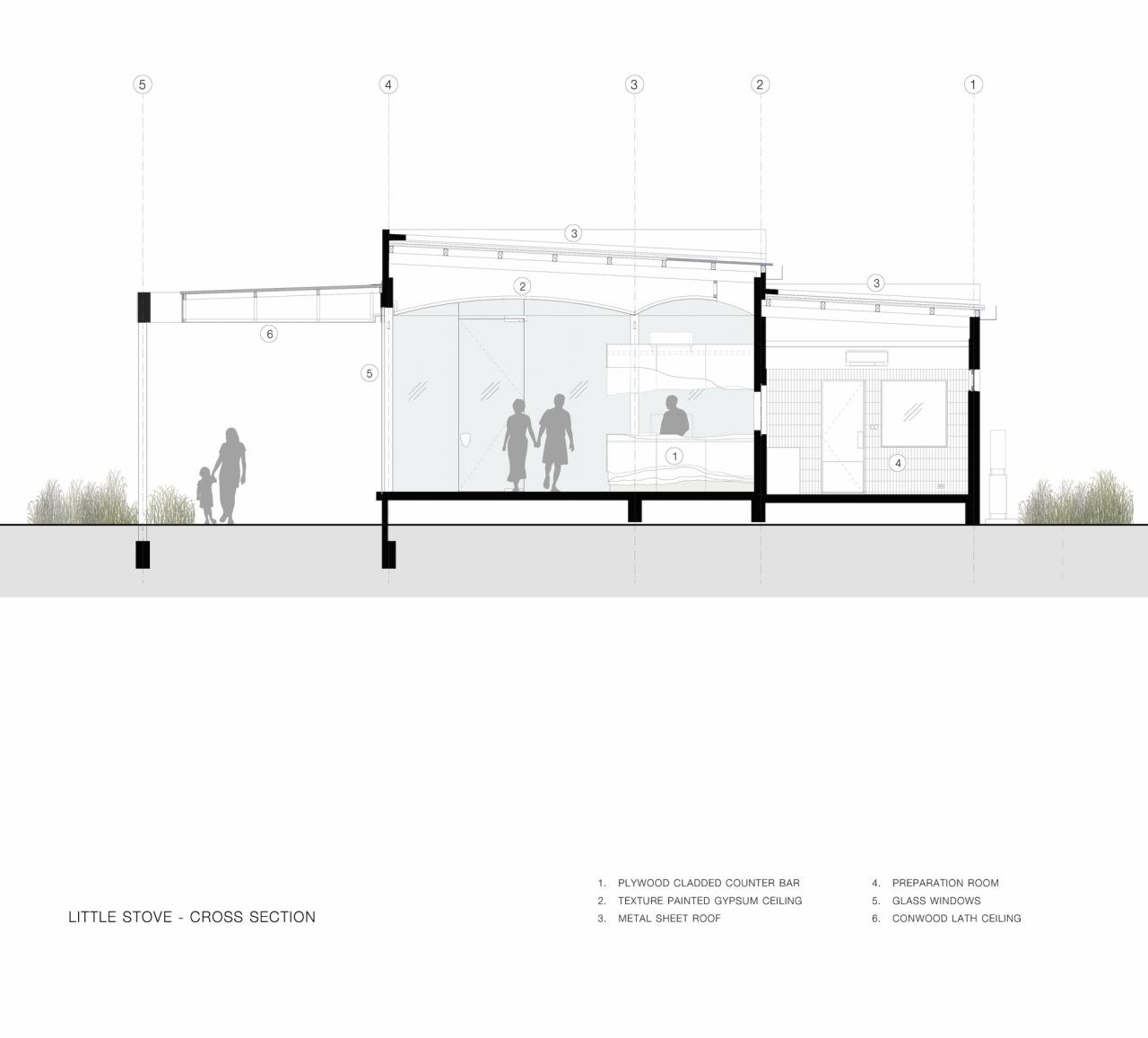 小火炉:咖啡店的曲线提取了伞的抽象轮廓;弯曲的屋顶线从外部遮篷持续延伸到内部天花板。室外座位区环绕着玻璃幕墙的后角。它被放置在一个4米高的大型天蓬下,提供舒适的遮阳,从而鼓励访客使用户外座椅,使游客更接近宽敞的户外花园,俯瞰安静的水道和榕树。