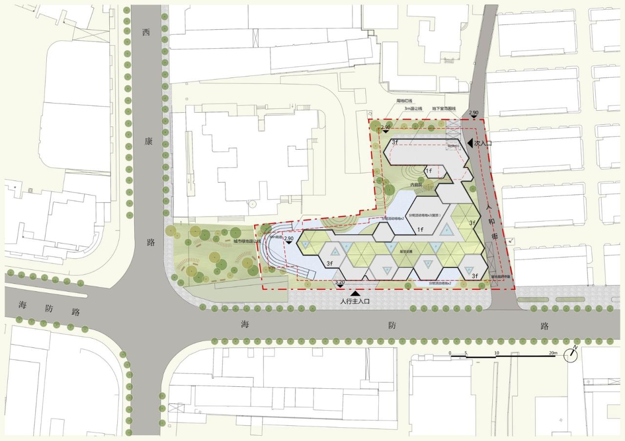 受此启发,在设计余姚路幼儿园时,我们从人文视角出发,重新审视它与城市的关系,进而提出校园建筑就是“微型里弄”的观点——设计应注重建筑的体量及其与地面的衔接,并应使其回归到人的尺度;强调街道界面有节奏的变化,展现出交流的姿态;选择适当的材料与色彩,传递符合自身定位的气质。