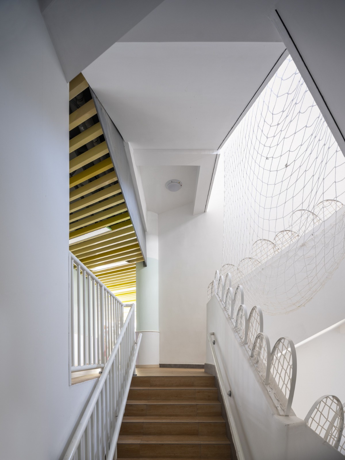 在回访中我们也留意到楼梯上被园方加设了许多护栏与防护网:究其原因是设计时所参考的房屋建造标准和教育局的标准并不一致,而这是未来我们做幼儿园设计时候必须注意的事。进入卧室空间的回访时,谭园长展示了抽拉式的小床与空间的高度适配:早上卧室与相连的活动室一同担当起活动教室的角色,午后将抽拉式床拉出放置,这个空间转换成卧室的功能。