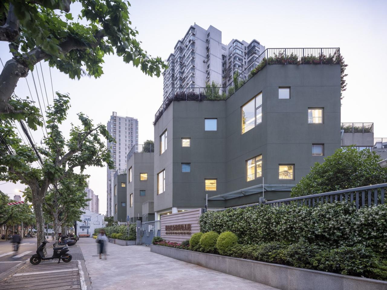 幼儿园建筑单体共三层,组合式的体量进一步消减尺度感,外立面墨绿+草绿的色彩组合,仿佛和沿路的梧桐树融为一体,在已经进入巨构时代的城市,保留一份自然与纯真。