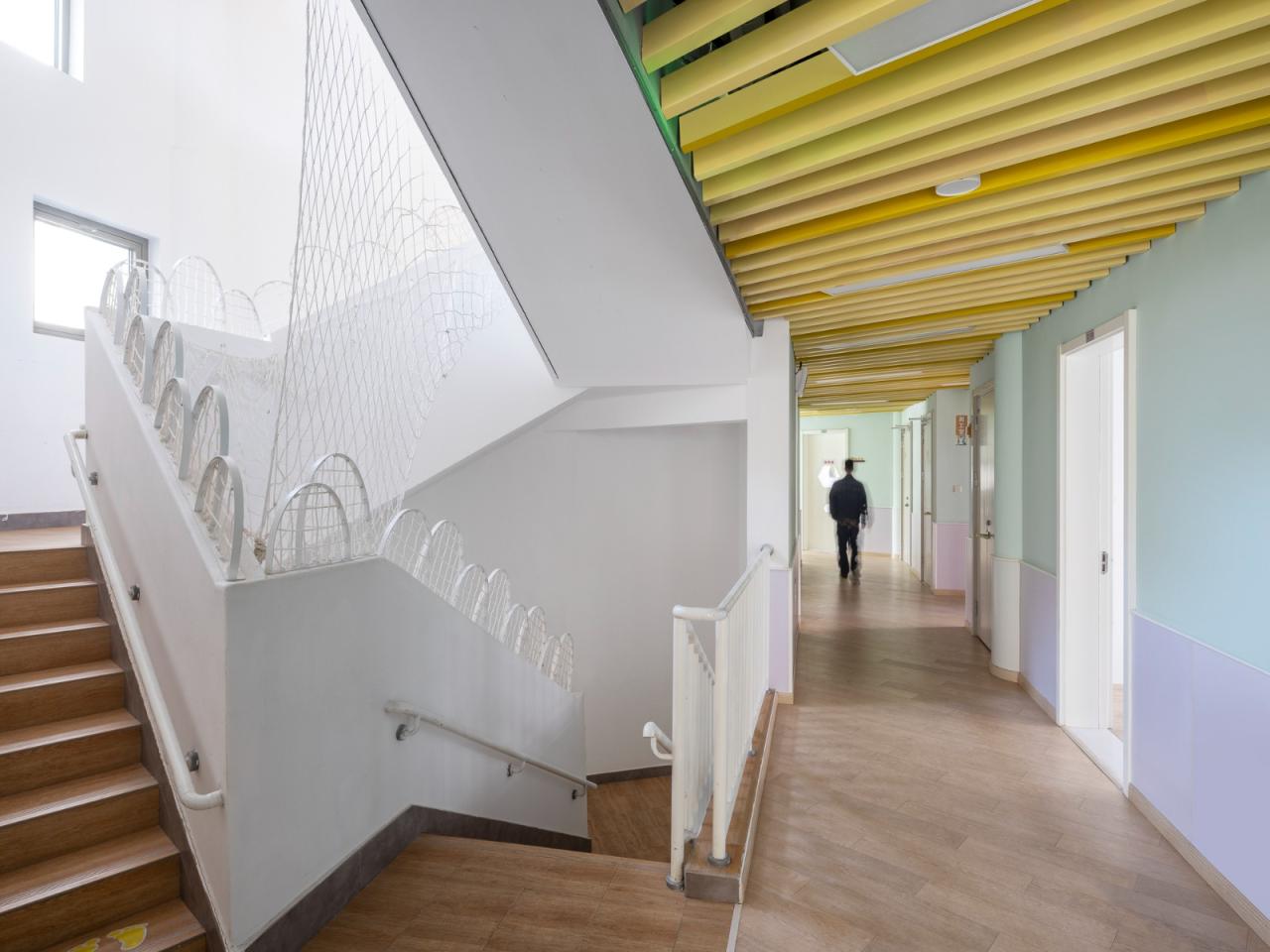 幼儿阶段的特殊性,空间的设置除了安全,更需要安全感。首层门厅与扩大走廊融合、为师生提供扩展活动空间,与外部空间的通透视线让老师能方便的照料到孩子;二层三层的走廊设置可互动的内嵌柜体,兼具休憩、展示功能。活动室玄关内退缓冲;活动室单元,似分似连的活动室与卧室通过活动隔断,既能独立使用,也能整体连动,适用于多样的生活、教学场景。