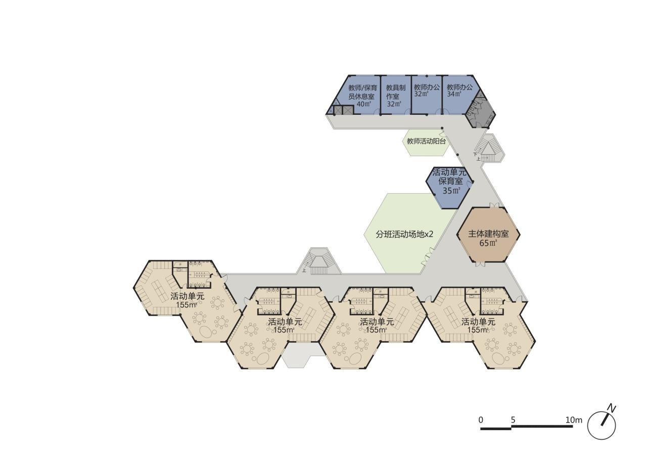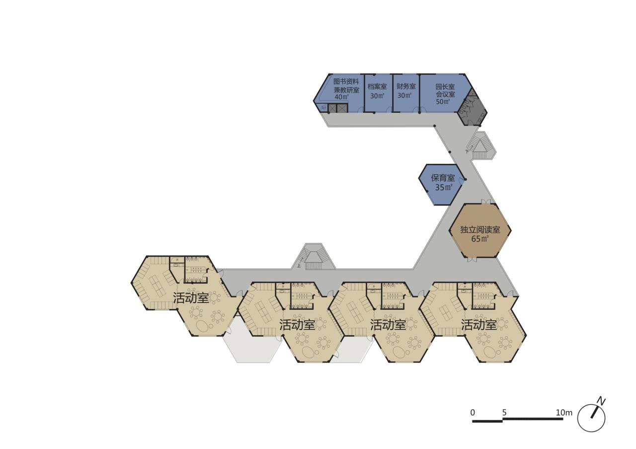 在幼儿园回访现场,我们也记录下落成后幼儿园的平面,与方案设计阶段的平面对照,虽发生一些明显的调整,仍遵循了六边形单元体为主的“启蒙几何”设计策略。