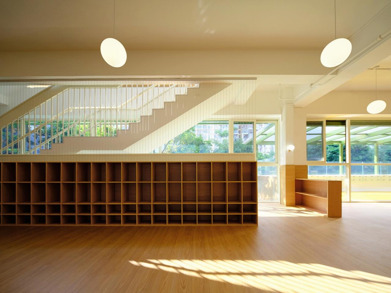 幼儿园的教学并不需要中小学式的全封闭课室,拆除教室与走廊间的隔墙在改善教室采光之余也可让每层儿童的日常自由活动范围扩大,这恰符合长期从事幼儿园设计的建筑师 Jure Kotnik 提出的“时间共享空间”理论。Kotnik经研究指出,当学校的学习、游戏、生活空间打通为一个自由平面后,儿童的自我认知能力、学习能力、社交技能与身体素质都可得到提高。