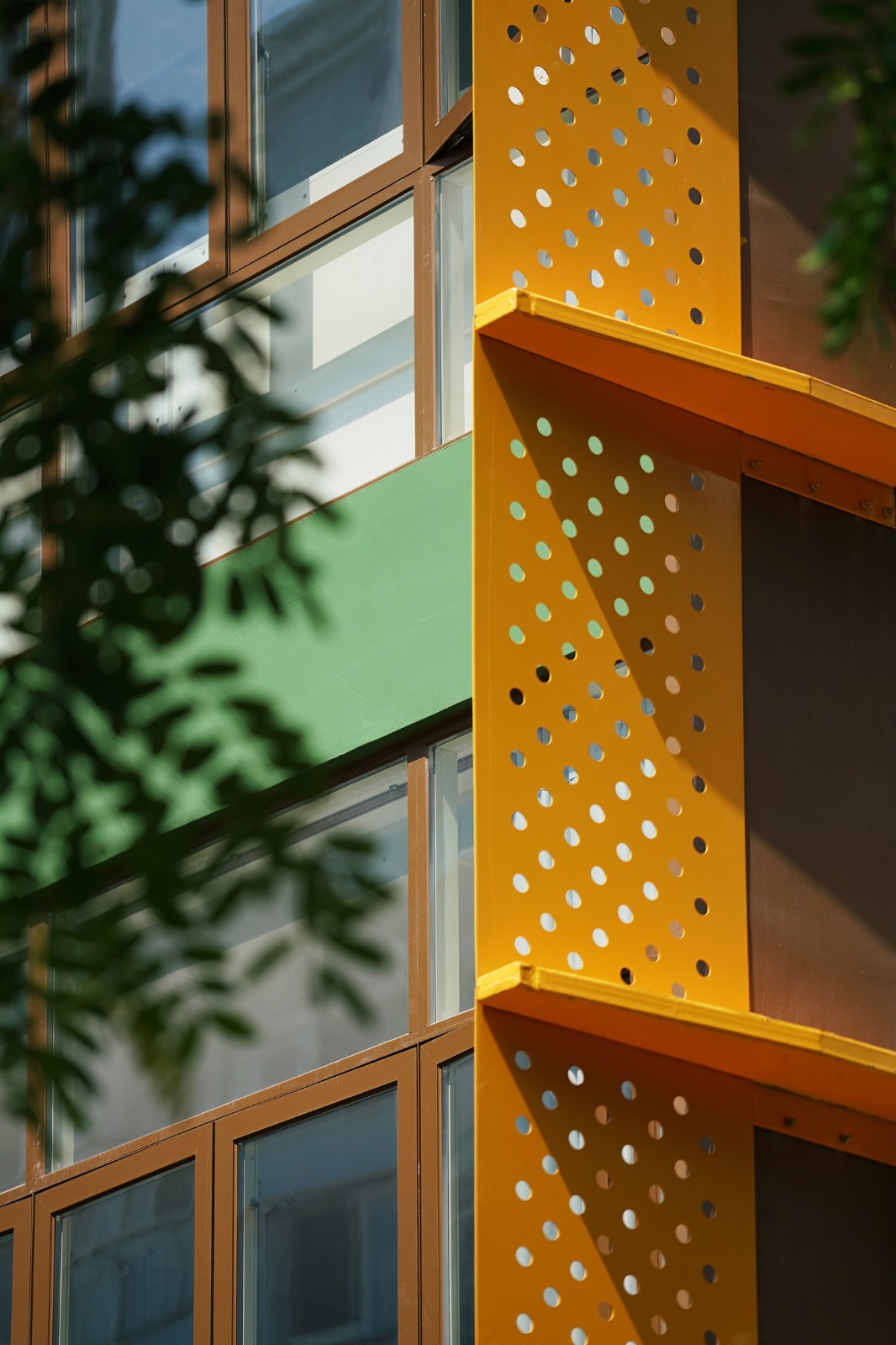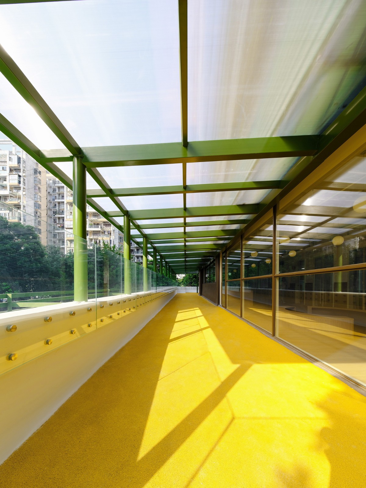 我们用新建钢结构檐廊取代了二层平台的加建玻璃棚。轻质的聚碳酸酯板屋面过滤直射光,并以自身弹性降低坠物风险。柔软的黄色EPDM地面既能保护儿童活动安全,又能通过光线漫反射提升室内走廊亮度。平台与走廊间的外立面实墙被改为通透的落地门窗,将室外景色和阳光引入建筑的同时,也连通室内外形成环状动线,吸引儿童自发到户外平台上探索。