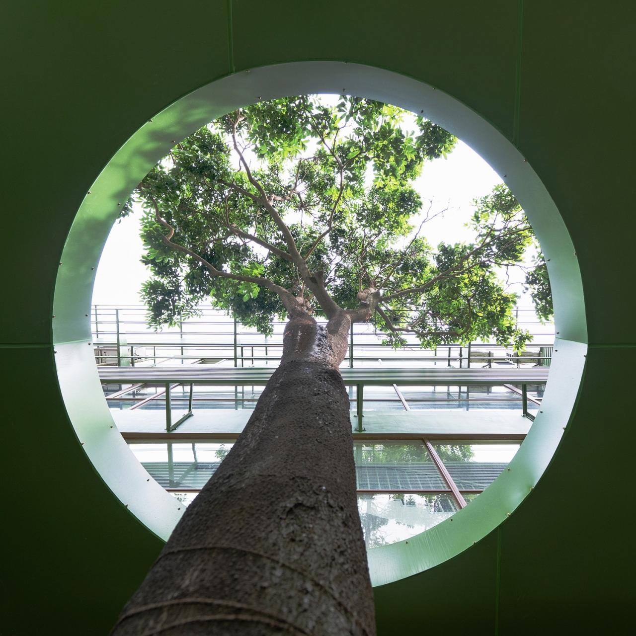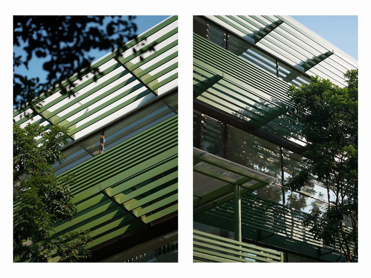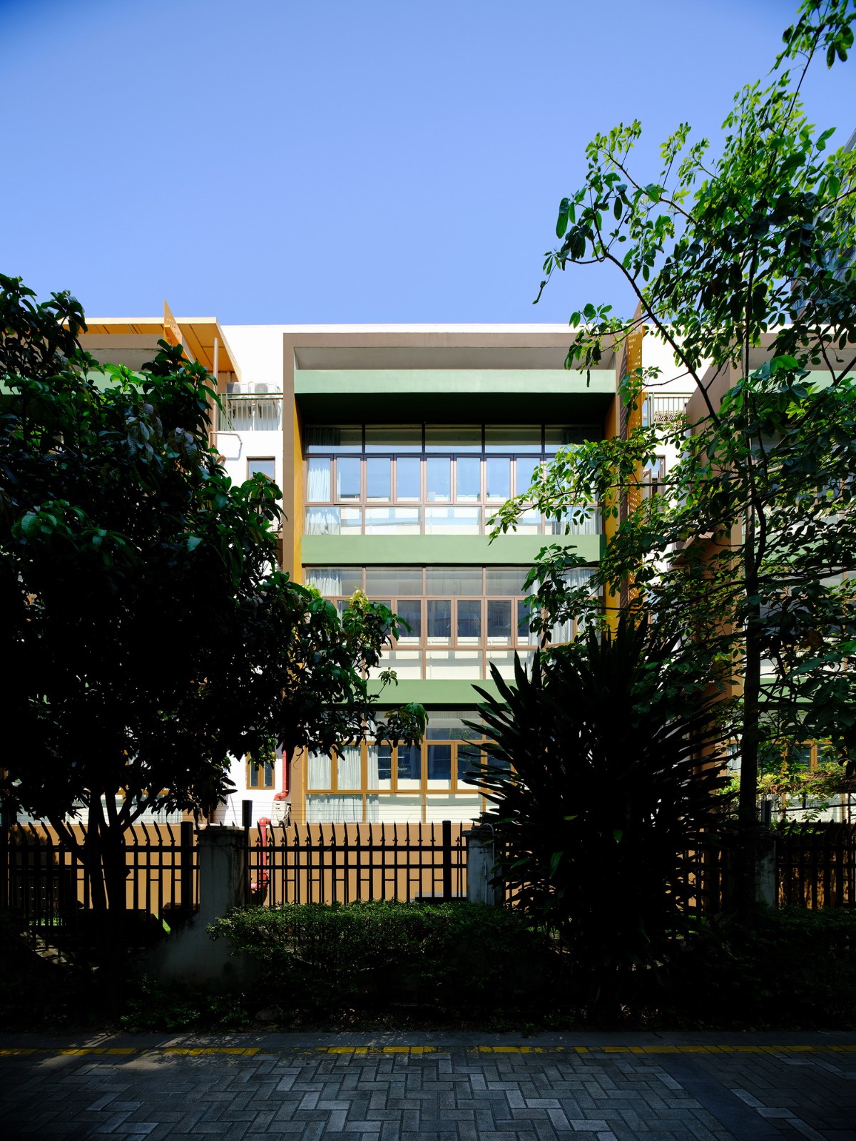 为改善室内采光,我们把音体室立面窄窗改为大型圆、拱窗,并在东南立面的教室窗外安装了反光板。在西北立面,我们将走廊窗洞扩至极限,并设置了遮阳百叶、空调机罩和首层、二层平台的檐廊,它们共同形成多条如同层叠的树盖般横贯整个立面的绿色水平线条,充分利用建筑本身横向展开的体量比例,简单而强势地统合了改造前纷乱凹凸的外观,构成新的建筑形象。音体室的圆窗则如同透过树荫升起的初阳,成为主立面的点睛标志。
