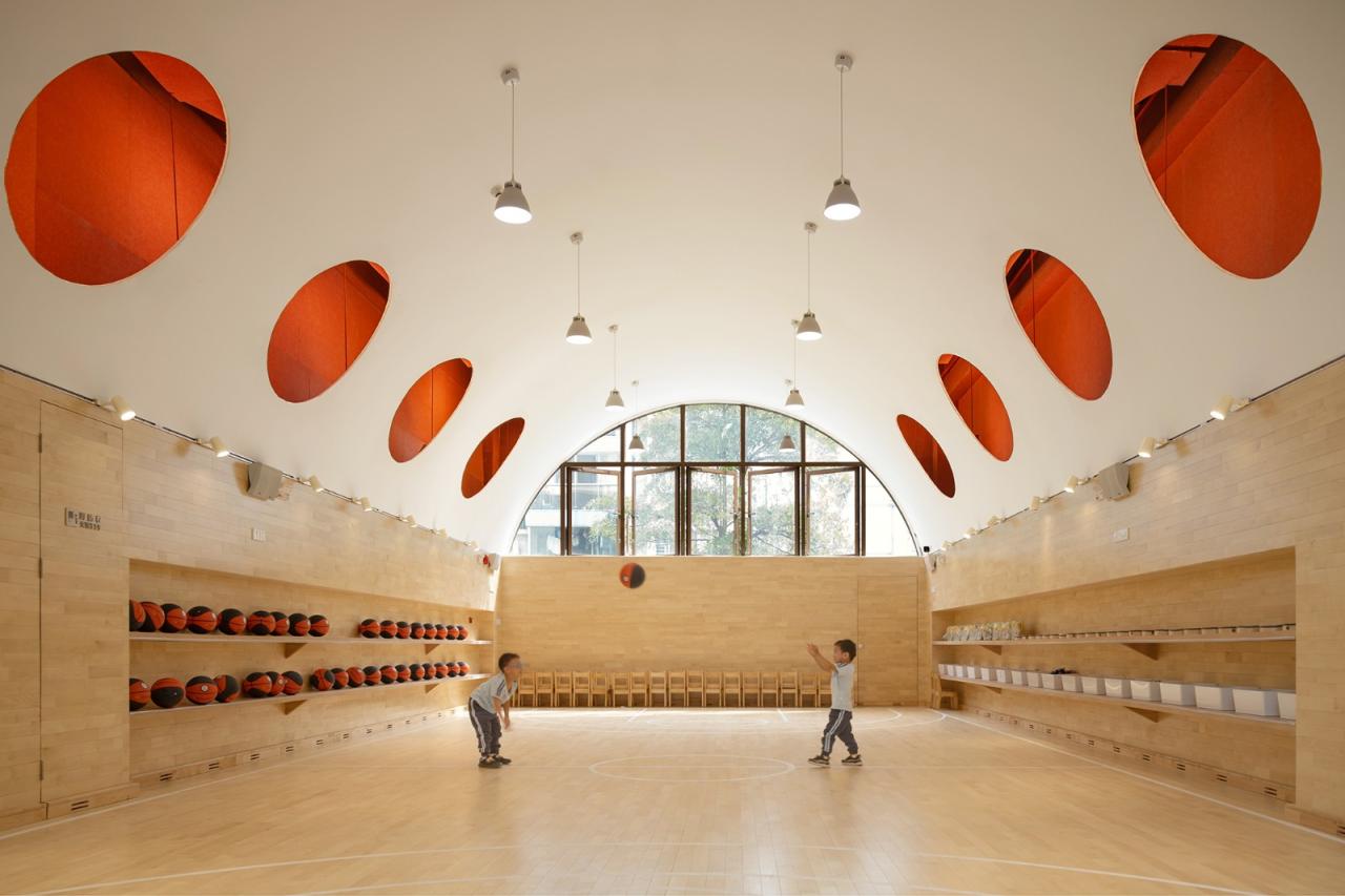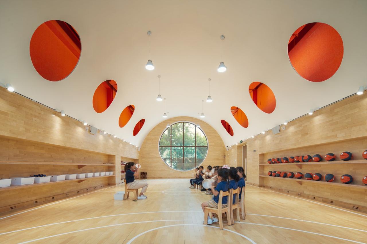 作为幼儿园最大的室内集会空间,音体室拆除违建夹层后的空间挑高达到5米,虽可满足室内篮球场功能,但对儿童来说尺度过于空旷、缺乏安全感。因此,我们将天花设计为一面巨大的拱顶,既保证篮筐处净高,又以垂翼营造出舒适的空间包裹感,还可利用拱顶两肩隐藏杂乱的暖通管道。