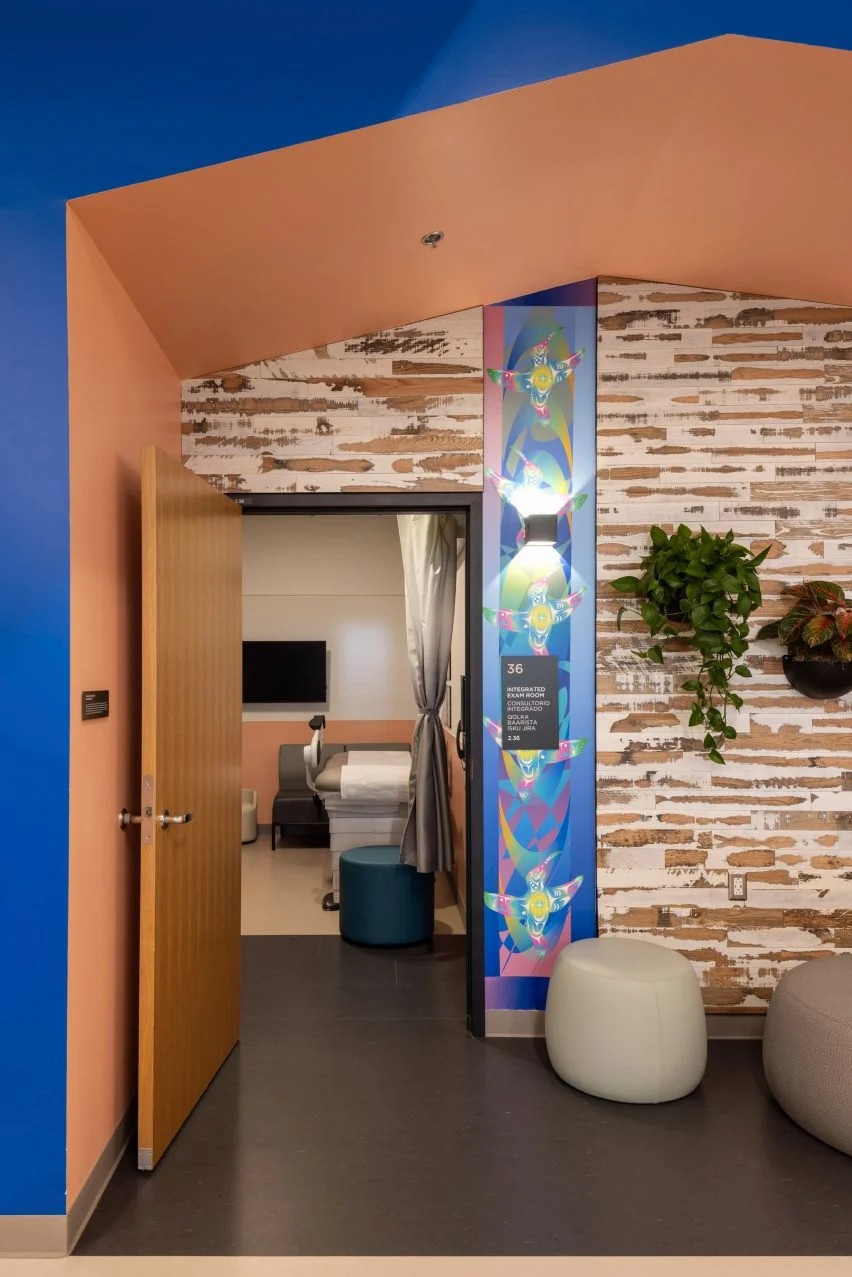 一系列的医疗室——用于检查、治疗、咨询、会诊和成像——被安排在候诊室周围。作为一个“城镇广场”,中心空间以舒适的家具和学习和阅读区域为特色。熟悉的元素,如前廊和邻里街区,启发了诊所的某些设计特征。明亮的色彩受到当地环境的启发,旨在“表达活力和喜悦”。