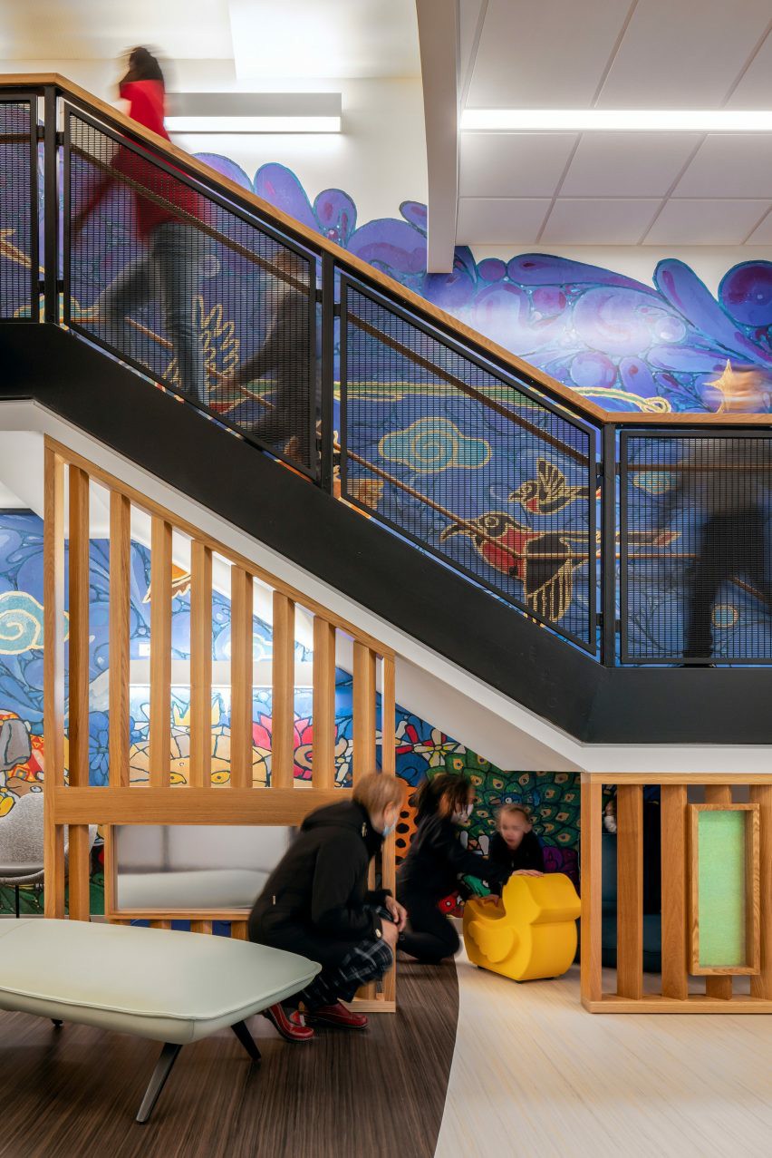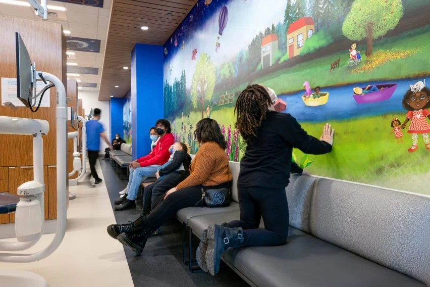 NBBJ 工作室说:“传统的设计过程并不统一,它并不特别适合弱势社区,”NBBJ 工作室向包括患者、家长、医疗从业人员、托儿服务提供者和其他人在内的一系列利益相关者征求了广泛的意见。这些意见直接塑造了空间的设计。