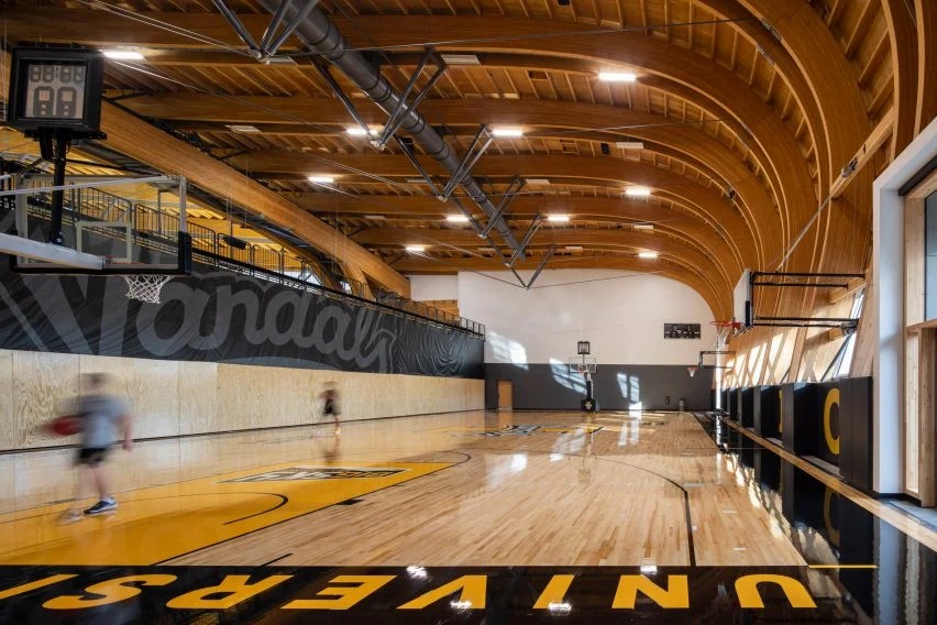 该建筑工作室说:“通过在大跨度应用中使用大量木材,该项目打破惯例,打造了一个独一无二的运动场。”