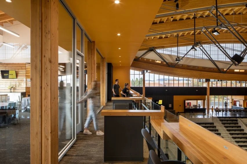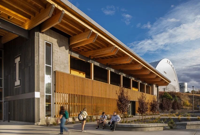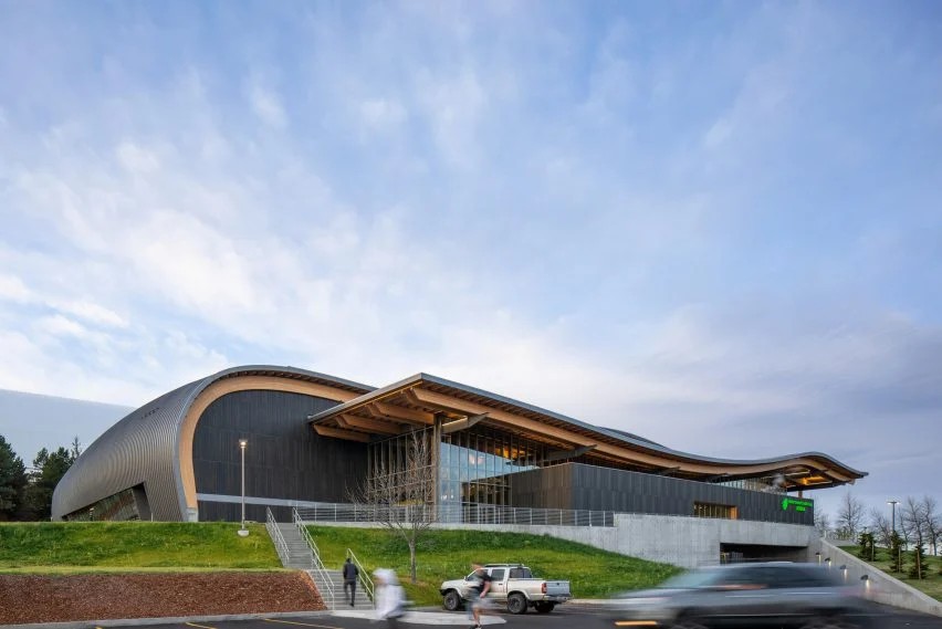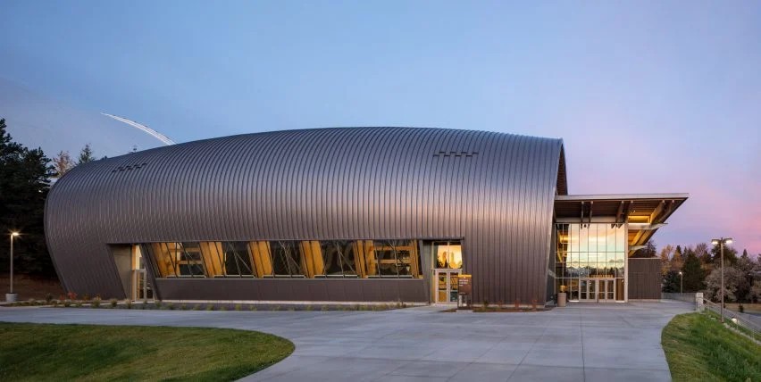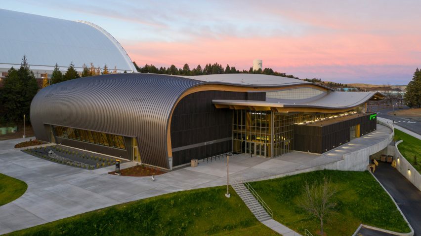 这座多层建筑位于一个平缓的斜坡上,由覆盖着圆形金属外壳的直线体组成。该地区的地形启发了贝壳的雕塑轮廓。该团队表示:“帕卢斯(Palouse)地区的起伏景观为屋顶的结构和形式提供了信息,这是由冰河时代末的米苏拉洪水造成的。”。