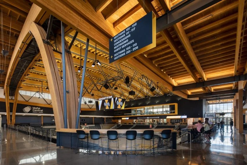 该团队表示,木材暴露在外,使结构系统处于“竞技场体验的前沿”。头顶上,巨大的木梁穿过最高点高达59英尺(18米)的天花板。