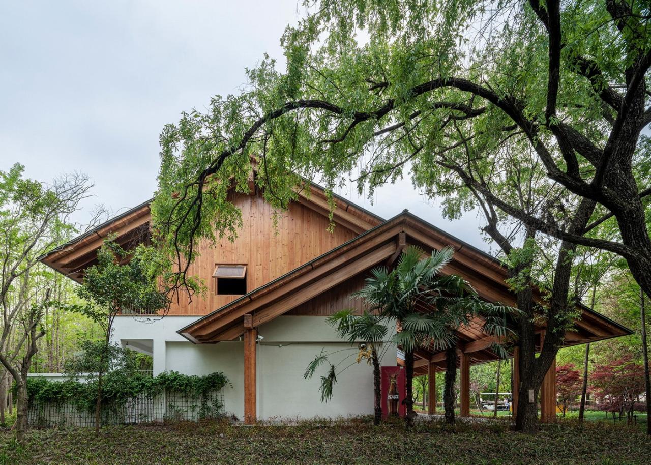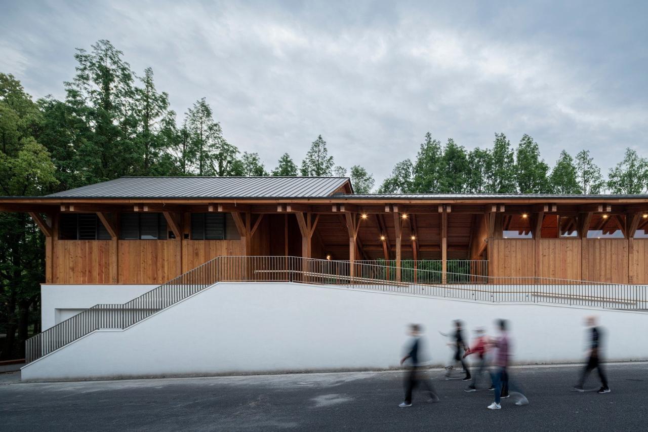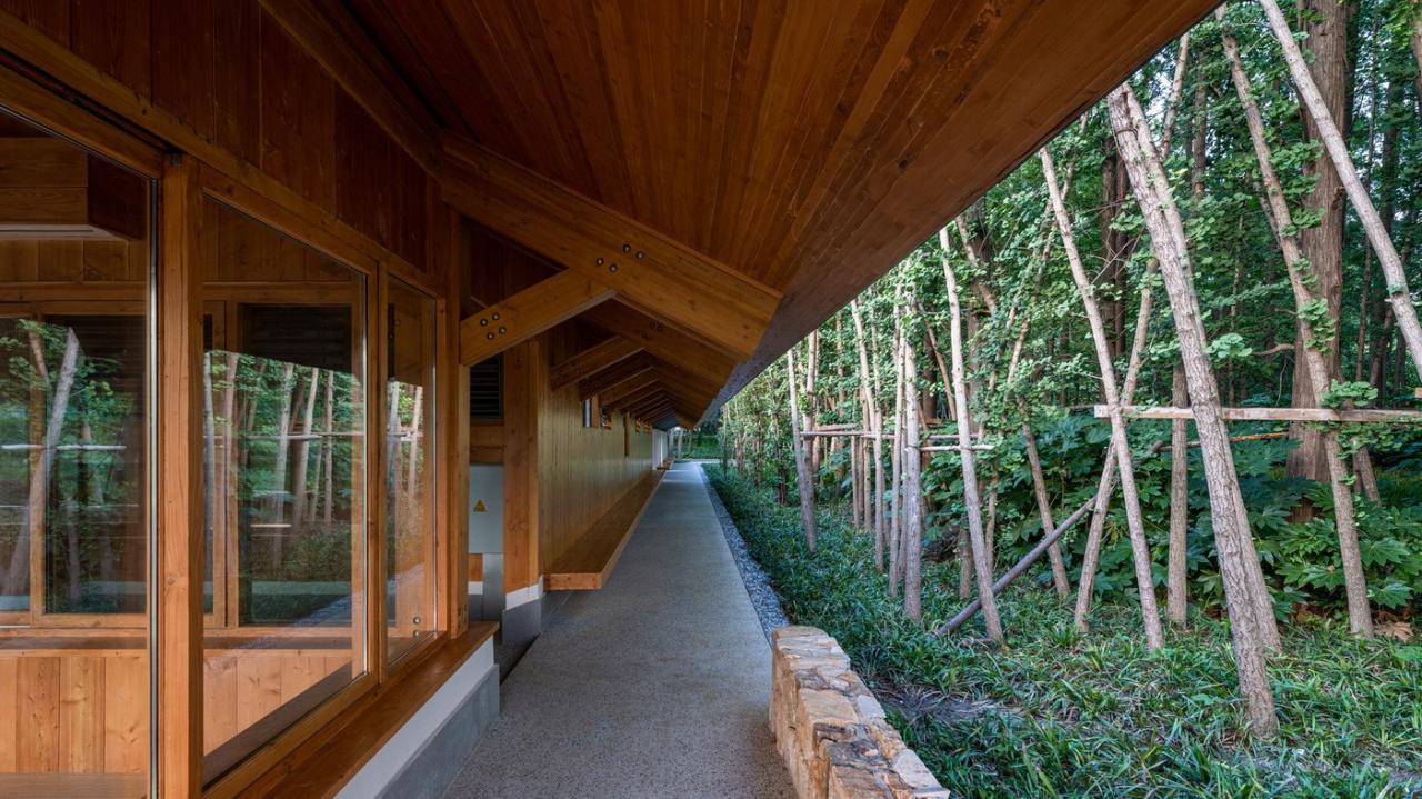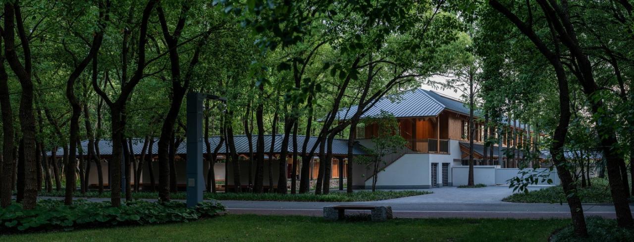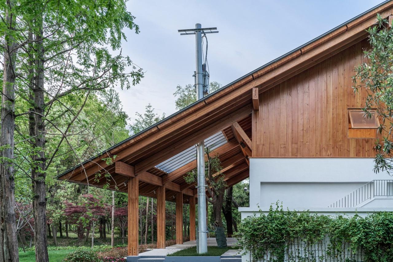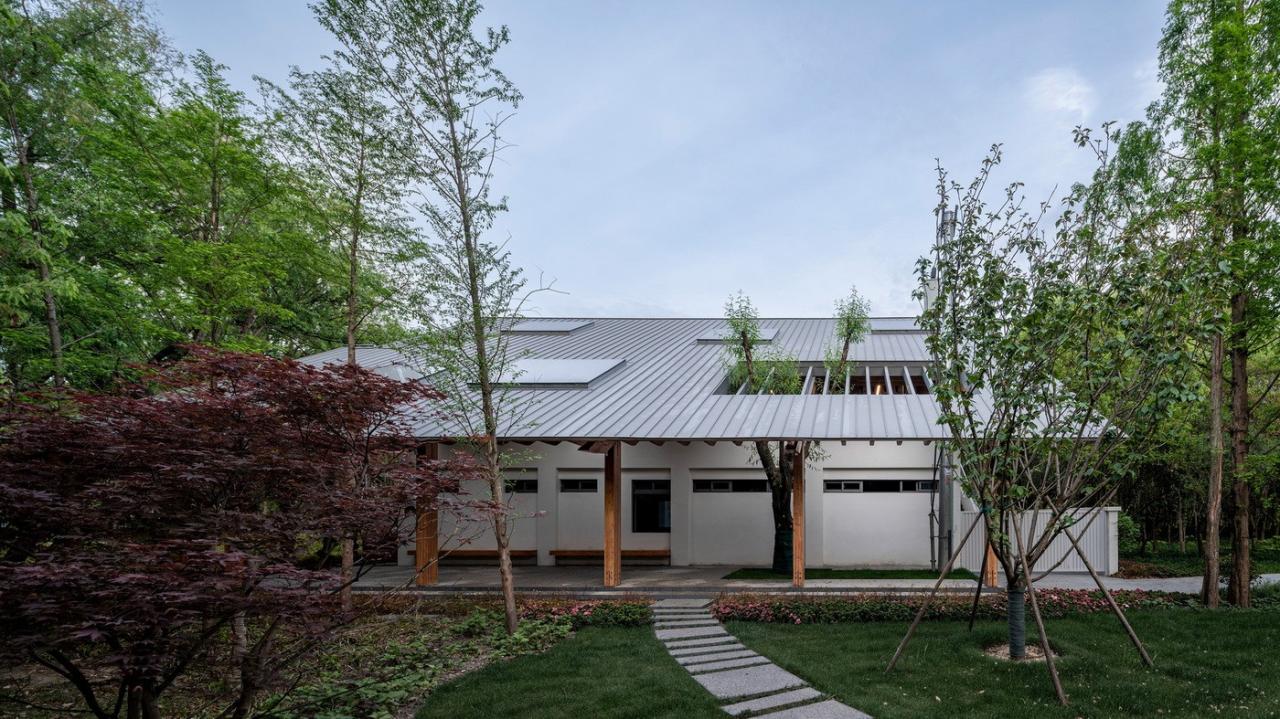 遵循于平实、庸常中接纳使用者的自在及参与的设计初衷,构造与材质的处理于温馨细腻中体现对于使用者的关怀。砖混结构基座施以白色肌理漆,上部是直接露明的木结构梁柱、望板、并结合木挂板的外立面处理。这种内外一致形成了外部界面结合环境、内部空间自然温润的体验感受。深出檐的坡屋顶采用哑光深灰色或银灰色的钛锌板或铝镁锰板金属屋面系统。