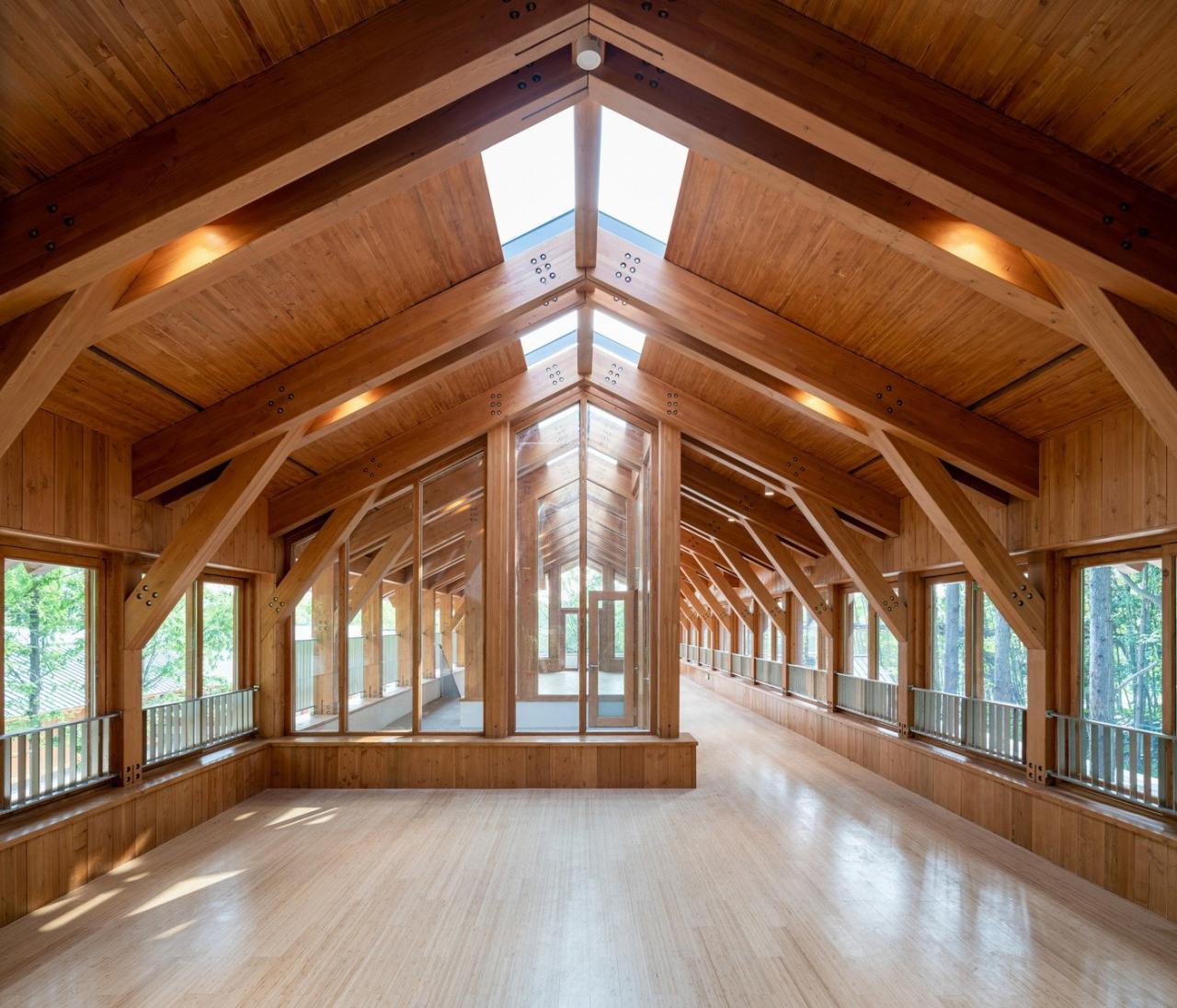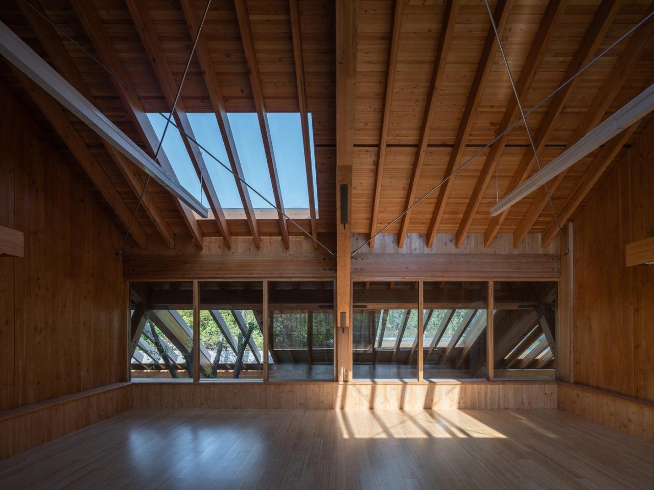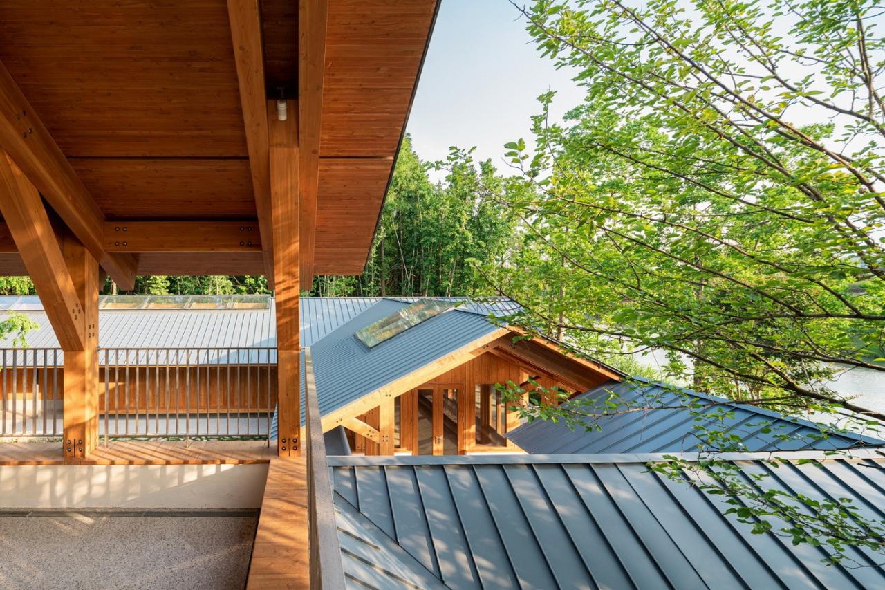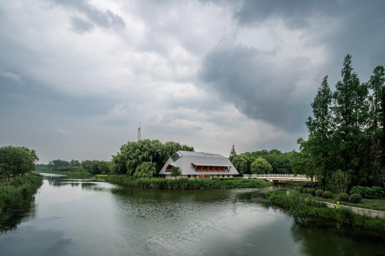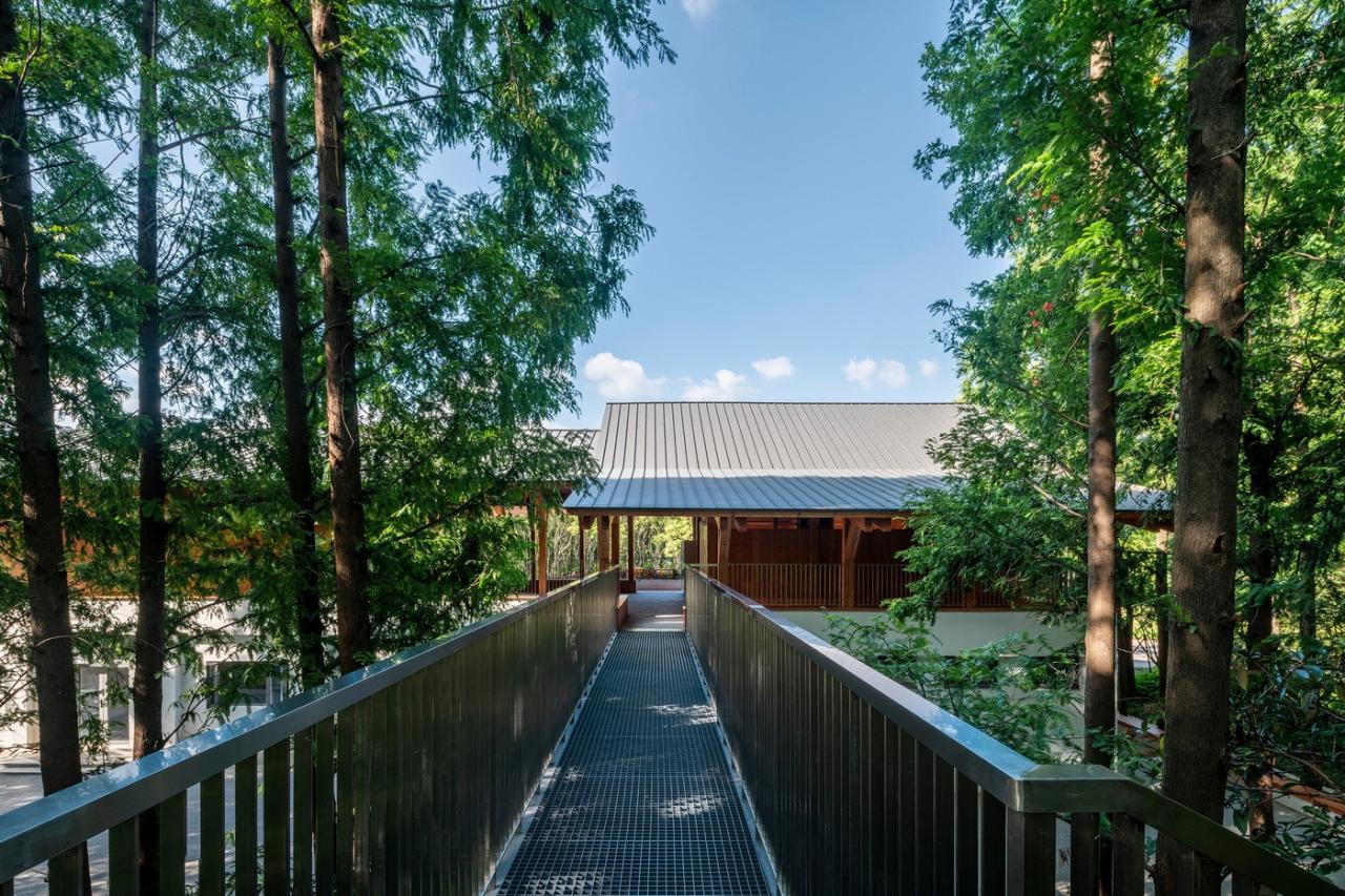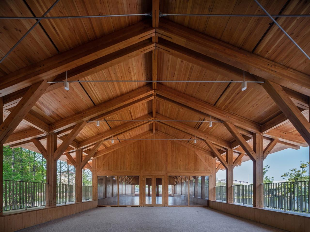 遵循于平实、庸常中接纳使用者的自在及参与的设计初衷,构造与材质的处理于温馨细腻中体现对于使用者的关怀。砖混结构基座施以白色肌理漆,上部是直接露明的木结构梁柱、望板、并结合木挂板的外立面处理。这种内外一致形成了外部界面结合环境、内部空间自然温润的体验感受。深出檐的坡屋顶采用哑光深灰色或银灰色的钛锌板或铝镁锰板金属屋面系统。