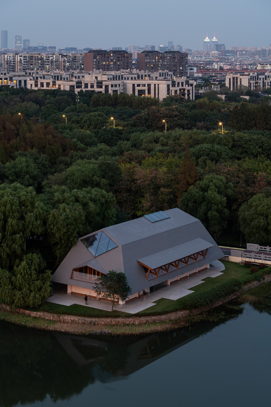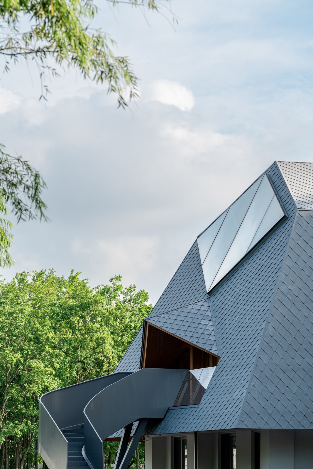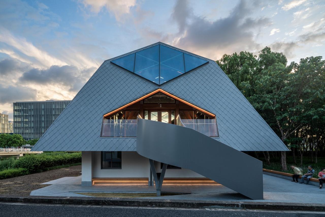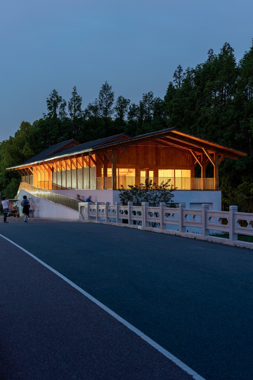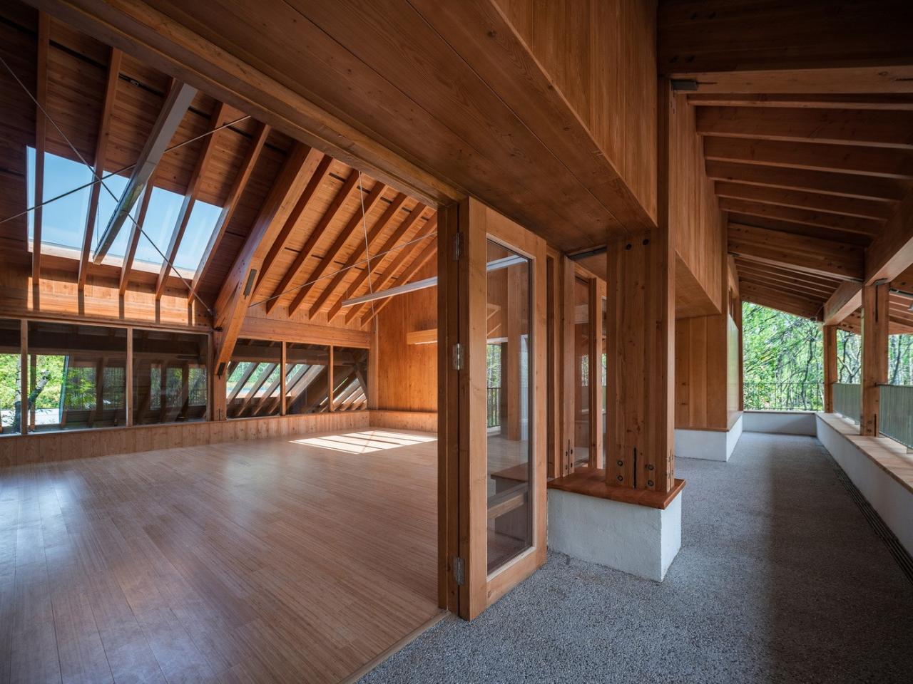 遵循于平实、庸常中接纳使用者的自在及参与的设计初衷,构造与材质的处理于温馨细腻中体现对于使用者的关怀。砖混结构基座施以白色肌理漆,上部是直接露明的木结构梁柱、望板、并结合木挂板的外立面处理。这种内外一致形成了外部界面结合环境、内部空间自然温润的体验感受。深出檐的坡屋顶采用哑光深灰色或银灰色的钛锌板或铝镁锰板金属屋面系统。