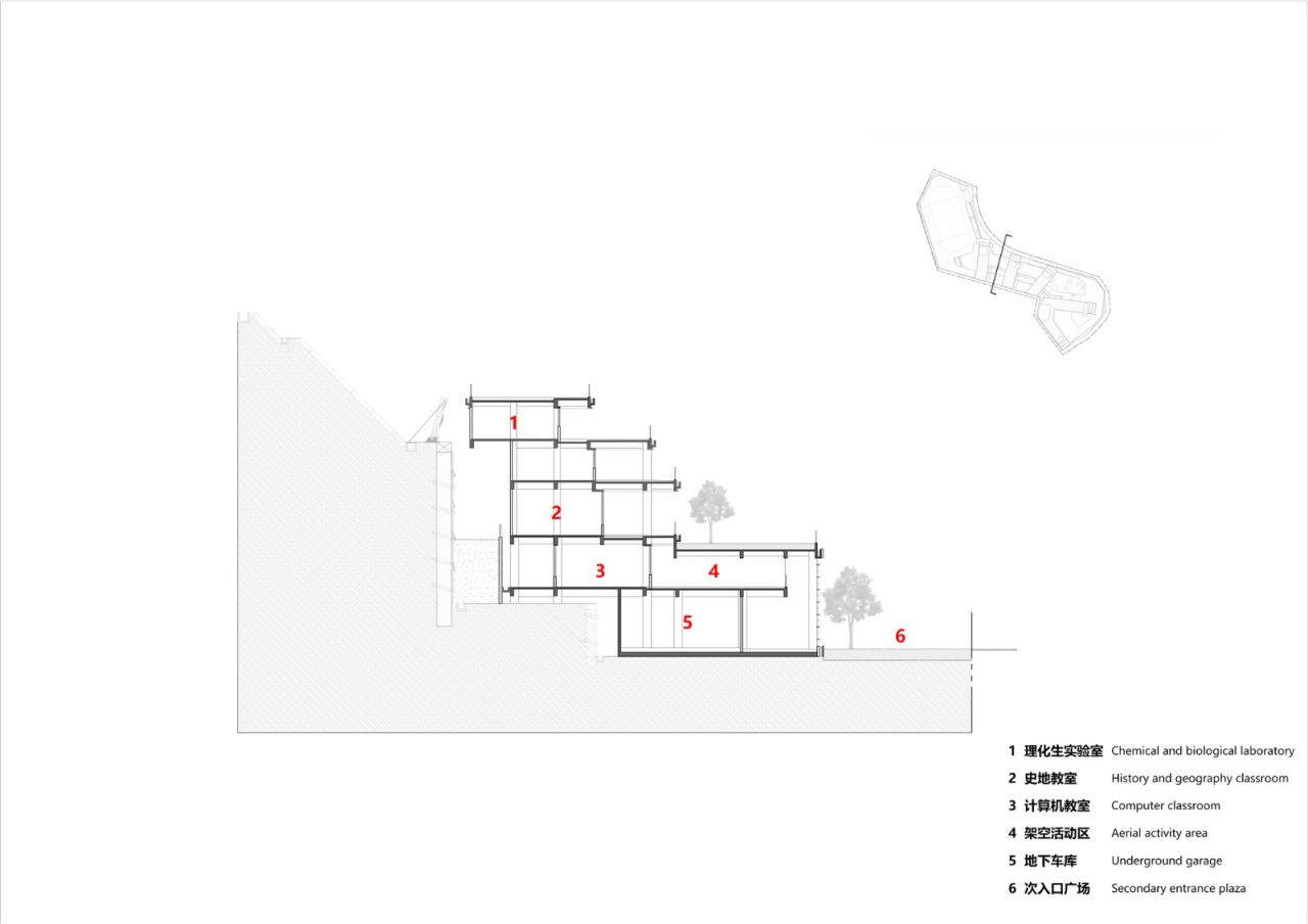 方案设计借助原山地高差形成的台地,在底层嵌入一个由架空活动、车库、音乐舞蹈等功能教室组合成的大板空间,将正负零抬高了10米。大板上作为校园公共活动平台,是校园实际的正负零标高,可以上消防车进行登高扑救,以解决高密校园的消防问题。