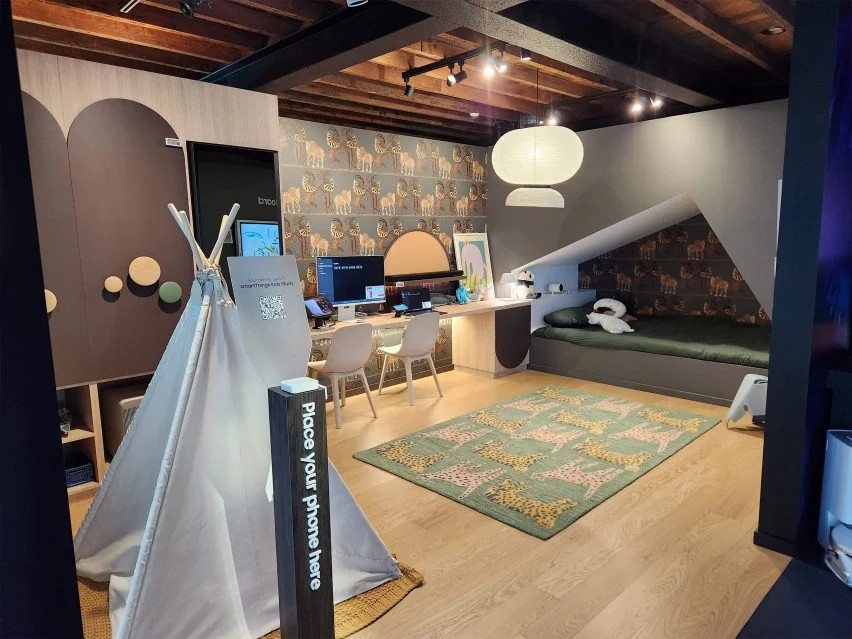 该店还设有游戏休息室,游客可以在其中使用游戏机实时玩游戏。此外,“智能用具家”(SmartThings Home)部分还包括一间儿童卧室,配有投影仪,游客可以在床上观看电影。三星的客户可以下载其“智能用具”(SmartThings)应用程序,在一个地方连接和监控他们的所有智能家居设备。用户可以使用应用程序中的“智能用具能力”(SmartThings energy)激活来监控他们的能源消耗,以减少他们的能源账单。