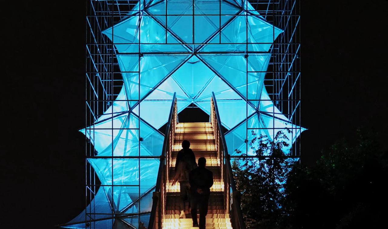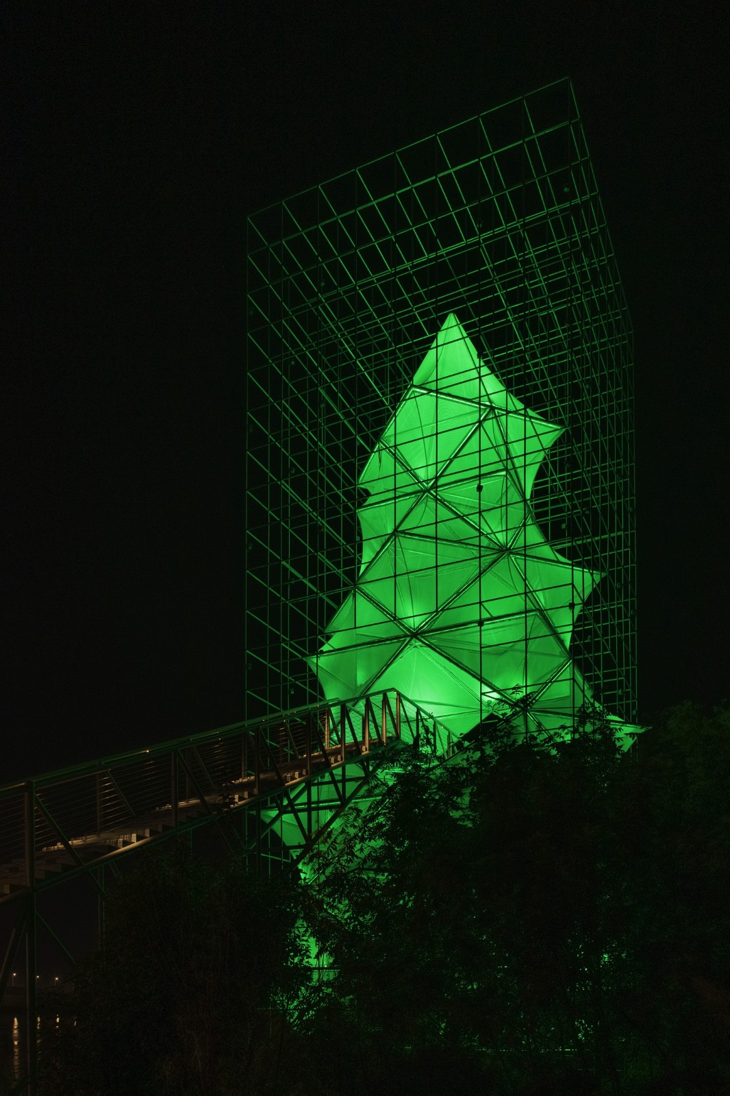 关于照明照明设计强化了钢结构和网格膜的几何美感,并通过精准设置照明的角度与反射,隐约地将原水闸管理用房从人造树中透出,描述着新与旧的关系。基础照明模式下,色彩选用工业感强烈的绿色灯光,进一步强调“人造树”的非自然属性。以水为主题的照明模式下,蓝色灯光配合水波纹灯,将江水的意向引入塔身,使“人造树”化身江畔的神秘水怪。