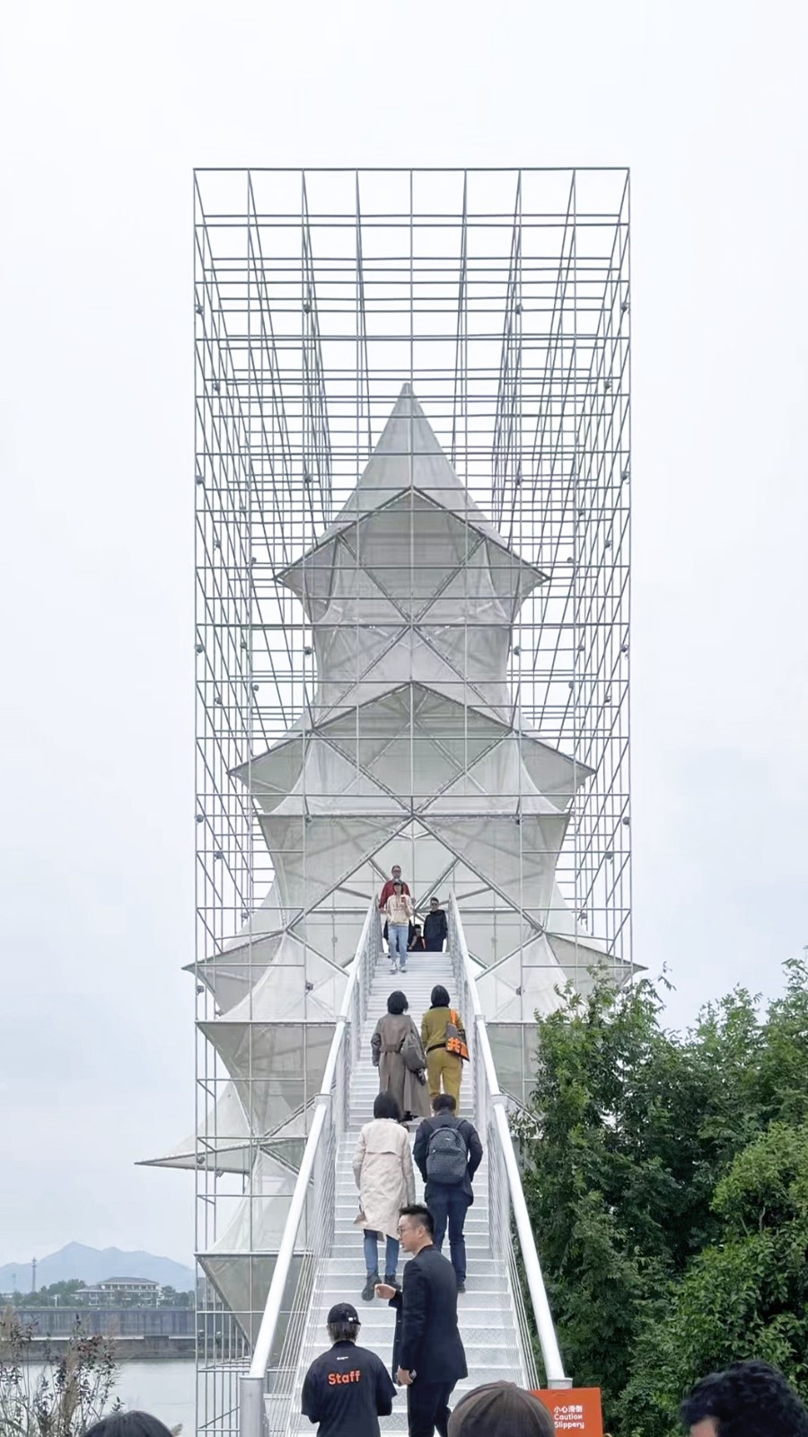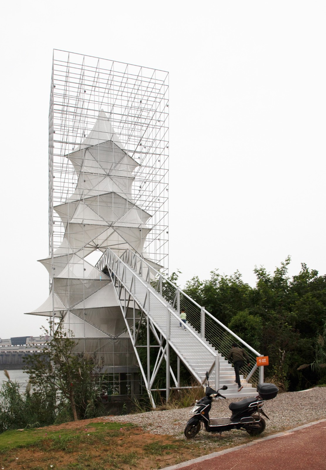 “人造树”,或是”塔的幽灵”?塔的形式蕴含了对人地关系的比喻:加建的钢结构网格,象征人类的理性控制;网格中正在被建造的“大树”,则是理性控制下被生产、被规训的自然之物(尽管我们能看到局部的冲突,“大树”在网格上撕开缺口,突围而出)。为什么是大树?大树的形象来自对落羽杉(常见于南方水边)的抽象,杉树与古塔在形式上也有相似之处。设计团队希望创造一个既像塔又像树的“模棱两可”的形象,来引发广泛的联想与多义解读。网格与“大树”的对抗关系,是对基础设施再造自然图景的抽象与比喻。而网格与塔,则期待能引发人们对于传统与现代、手工与机器,农业文明与工业文明等对立概念的思考。以后工业时代的土地伦理为信仰,“人造树”或将成为江边的新龙游塔,延续当地的建塔传统,与古塔互为观照。