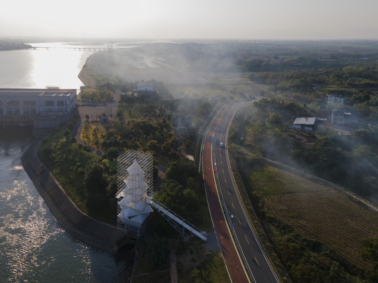 项目背景浙江省衢州市龙游县,和大多数县城一样,缺乏优势产业,造成大量劳动力外流问题。2022年,龙游县提出建设青年发展型县域目标。面对如何留住和吸引青年人的问题,中规院、风语筑和哔哩哔哩联合给出的解药是,策划一条“瀫石光·艺术生态走廊”——由27位/组(后扩大至40位/组)80、90后建筑师、景观师和艺术家共同创建,以独特的县域文化生活吸引年轻人重回龙游。有限设计工作室团队本次的设计内容包括一座观景塔的新建和对江边一座水闸管理用房的改扩建。这两个任务有着相同的目标,就是在整个项目入口处为整个艺术生态走廊创造出有视觉统领作用的地标。