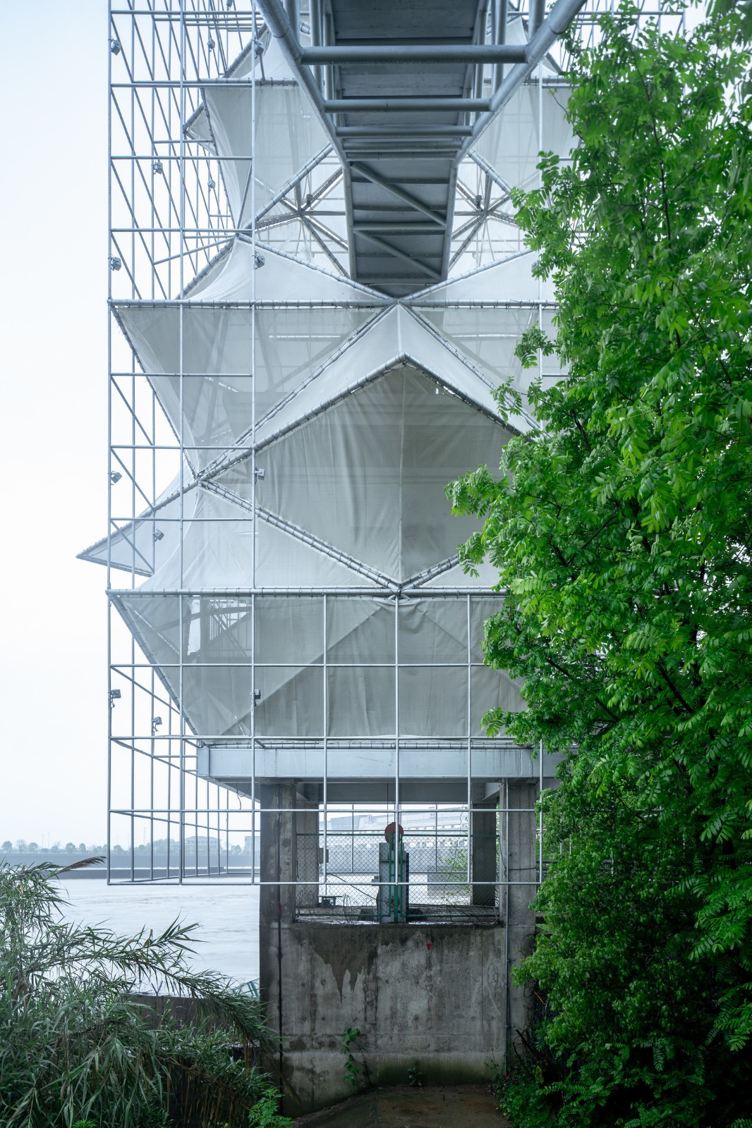 关于材料在材料和构造上也向基础设施学习,谨慎地选择简洁实用的材料,不设计过于精细复杂的构造节点,以确保施工方便和后期维护的便捷。网格膜材料轻盈透风,日常使用时能提供良好的通风效果,在极端天气情况下,如台风天,能降低风荷载保障结构安全。银粉漆作为主要涂料,所有钢结构构件和原有水闸房立面均统一刷涂,以强化“人造树”整体的雕塑感,在自然景观原本较为单一低调的入口区域,形成有力的标识作用。此外,银粉漆有利于光线反射,与半透明的网格膜共同渲染出层次丰富的照明效果。