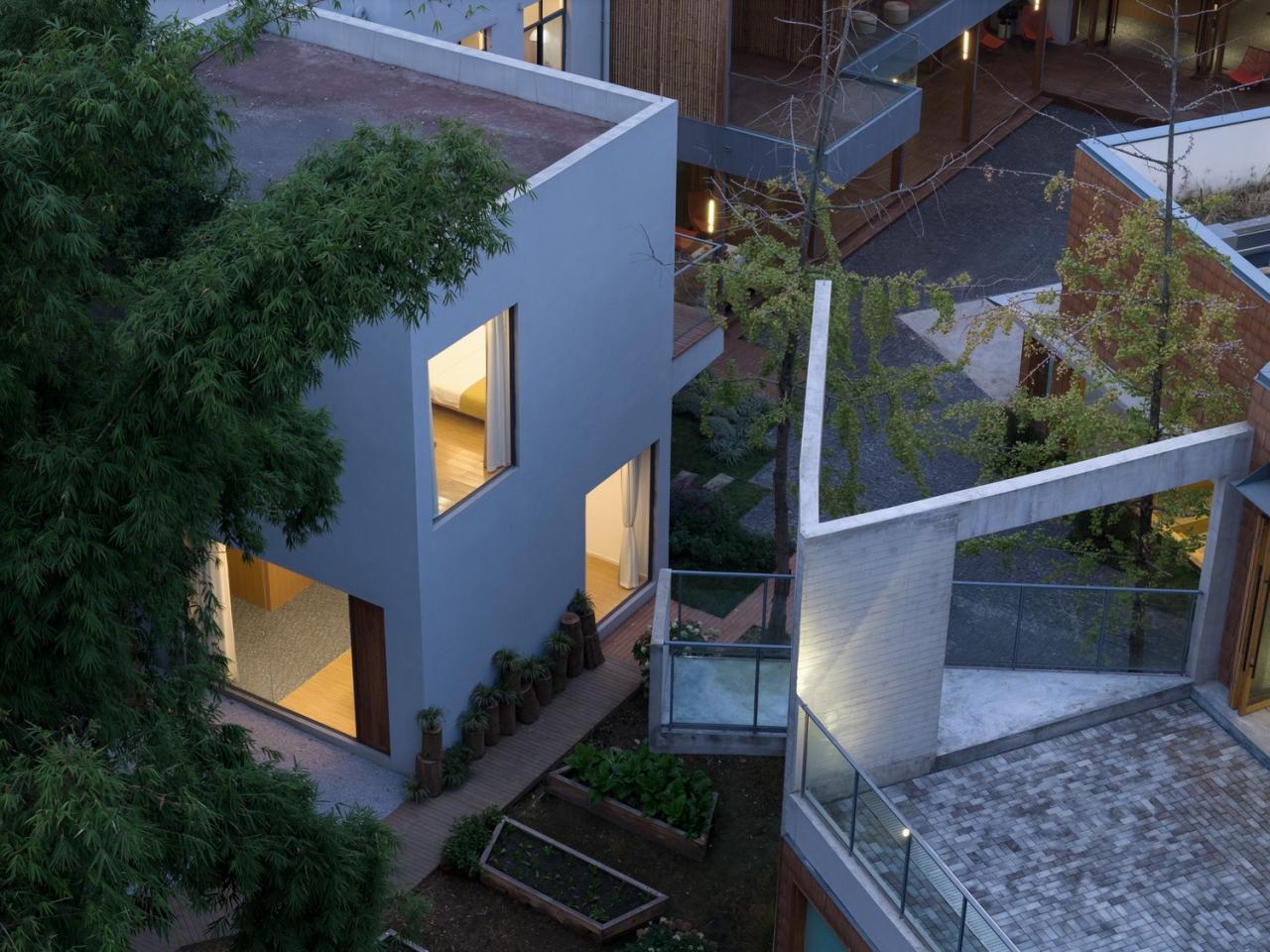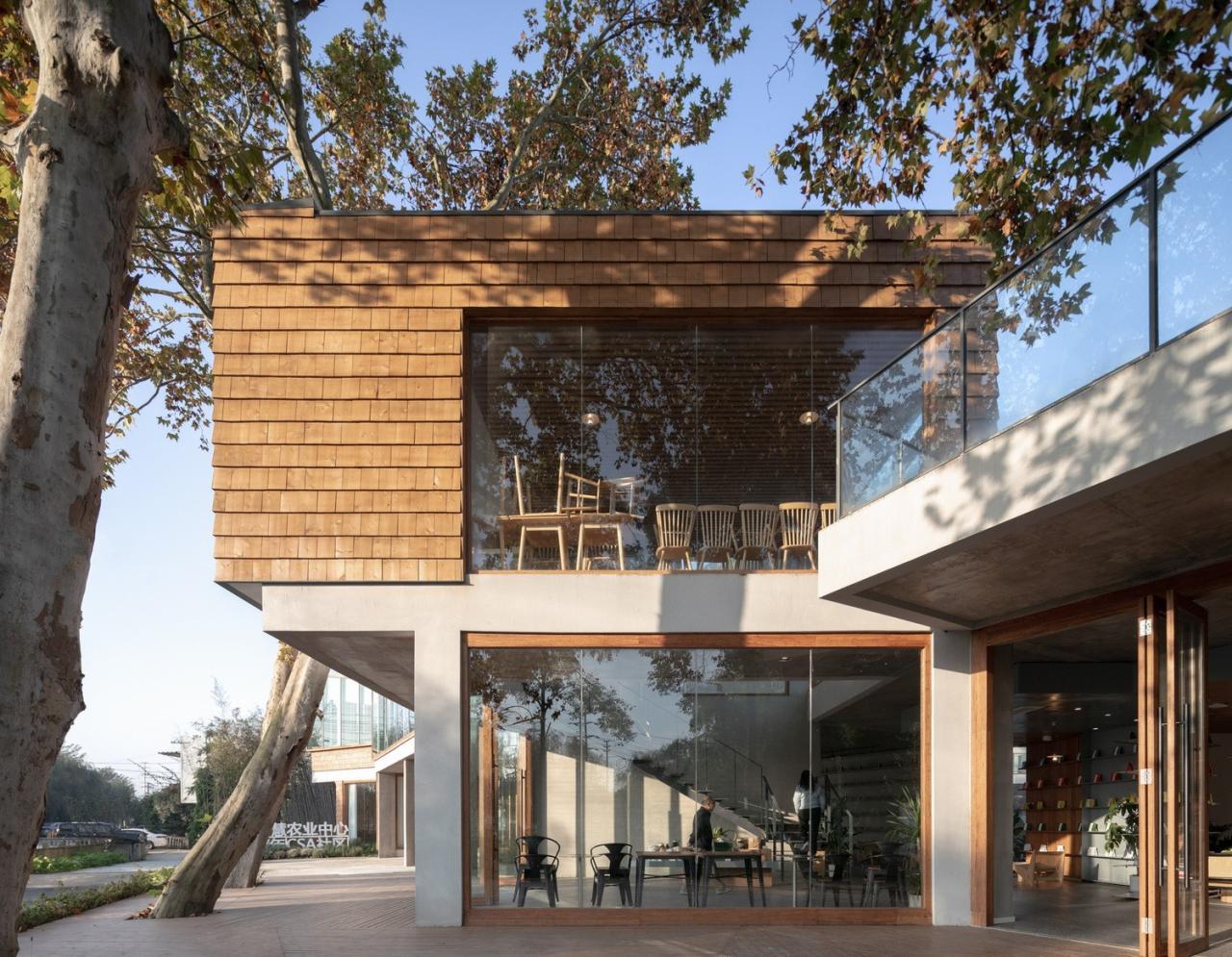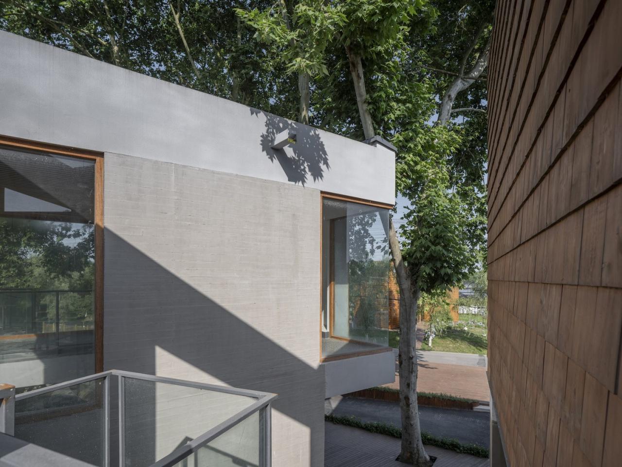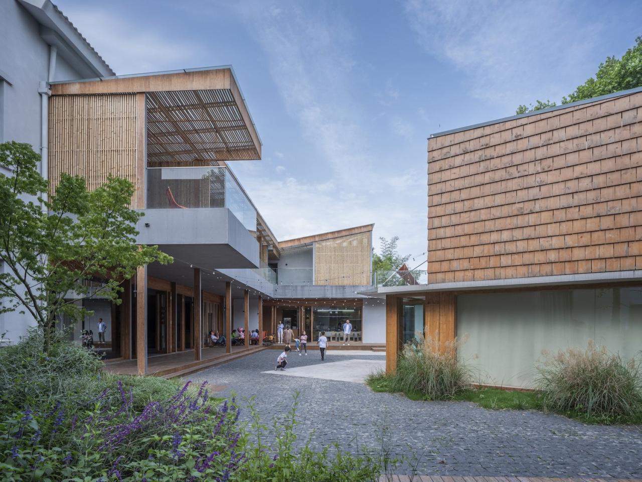 场地上原有的梧桐树从咖啡厅的上方穿过,形成一个可爱的“树屋”;宽敞的二层平台上搭起了帐篷;竹林中的玻璃屋支起了茶桌和麻将;院子内外随处可见欢乐奔跑的孩子们…建筑和使用有严格控制也有随性而成。在院子里环顾四周,混凝土、竹钢、木瓦和白墙这几种不同的材料语言相互碰撞混合,也更加强了这个乡村社区场所的热闹氛围。“混合社区”在使用了大半年之后,夏日重访,院子内外树影婆娑、郁郁葱葱,就像是有什么东西从场地上和房子里生长出来,生机勃勃。