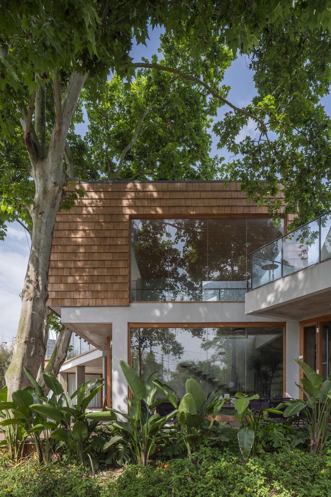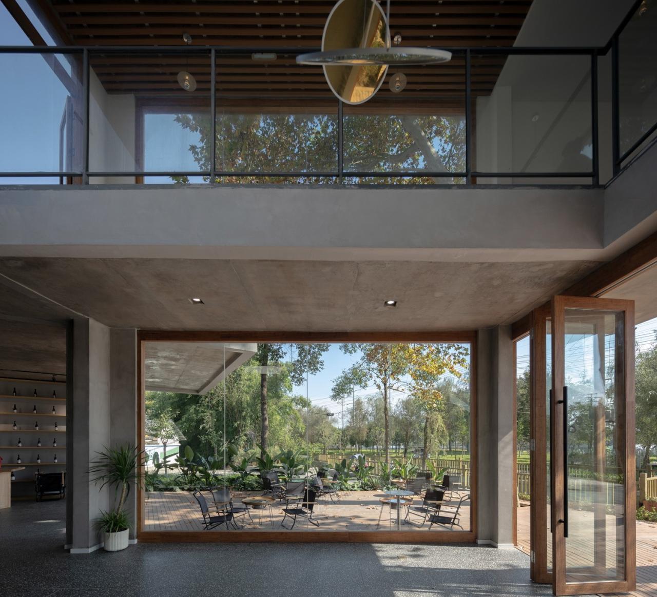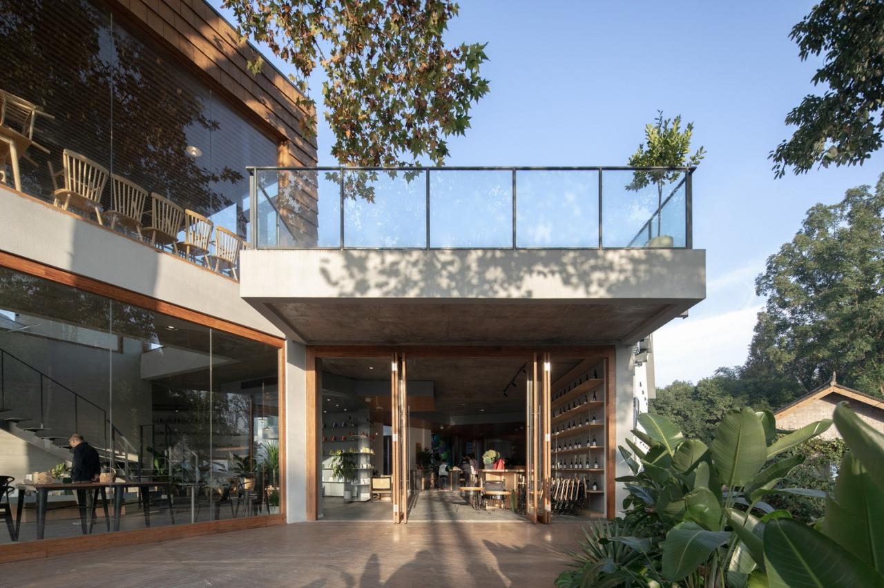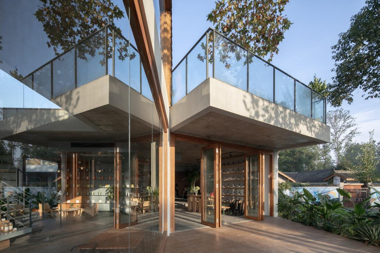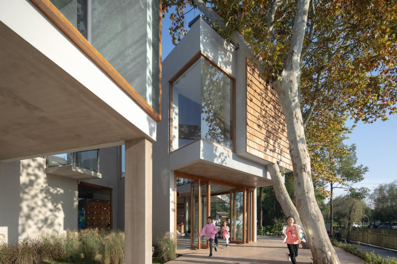 场地上原有的梧桐树从咖啡厅的上方穿过,形成一个可爱的“树屋”;宽敞的二层平台上搭起了帐篷;竹林中的玻璃屋支起了茶桌和麻将;院子内外随处可见欢乐奔跑的孩子们…建筑和使用有严格控制也有随性而成。在院子里环顾四周,混凝土、竹钢、木瓦和白墙这几种不同的材料语言相互碰撞混合,也更加强了这个乡村社区场所的热闹氛围。“混合社区”在使用了大半年之后,夏日重访,院子内外树影婆娑、郁郁葱葱,就像是有什么东西从场地上和房子里生长出来,生机勃勃。