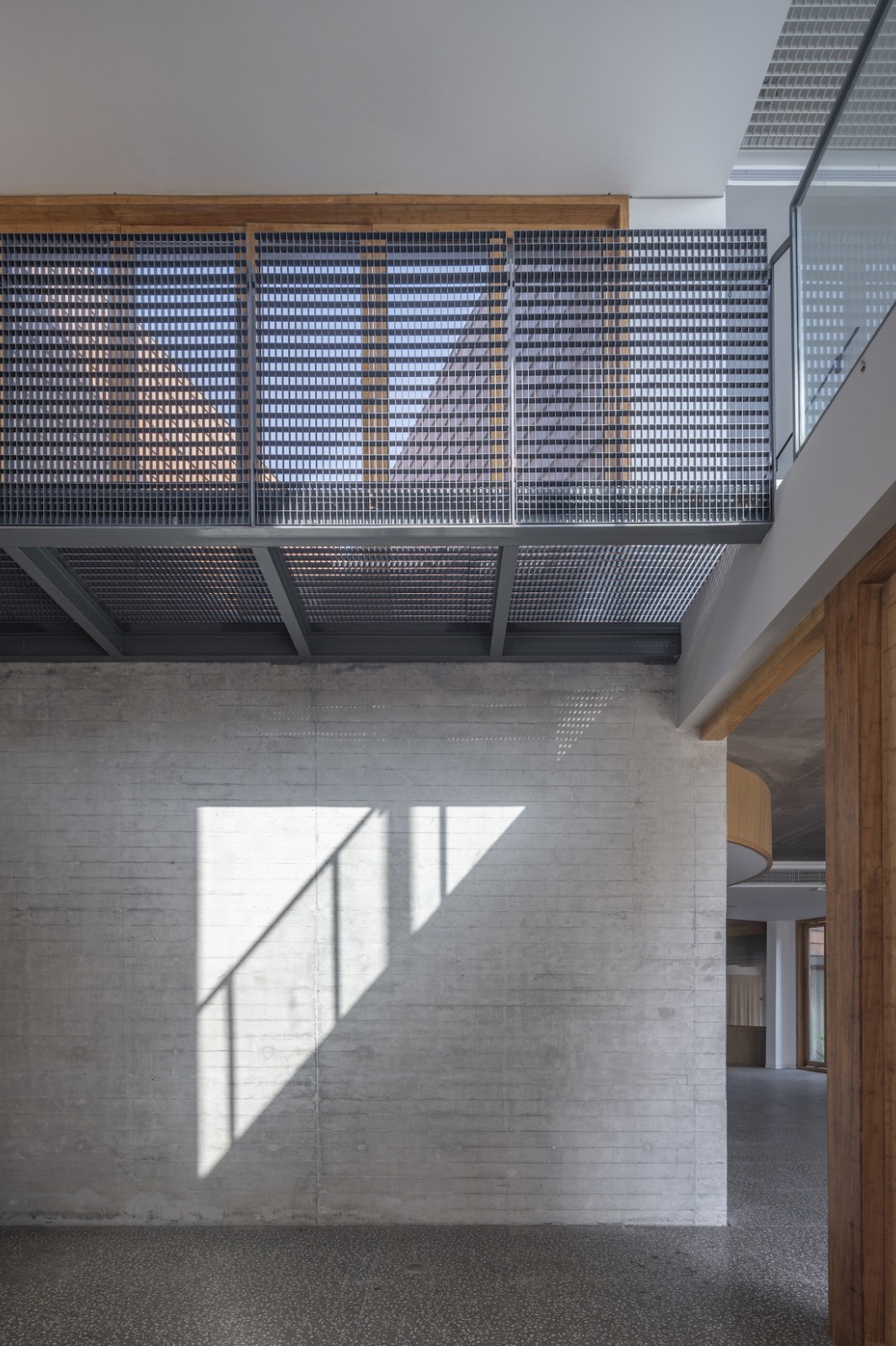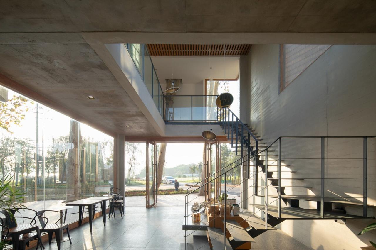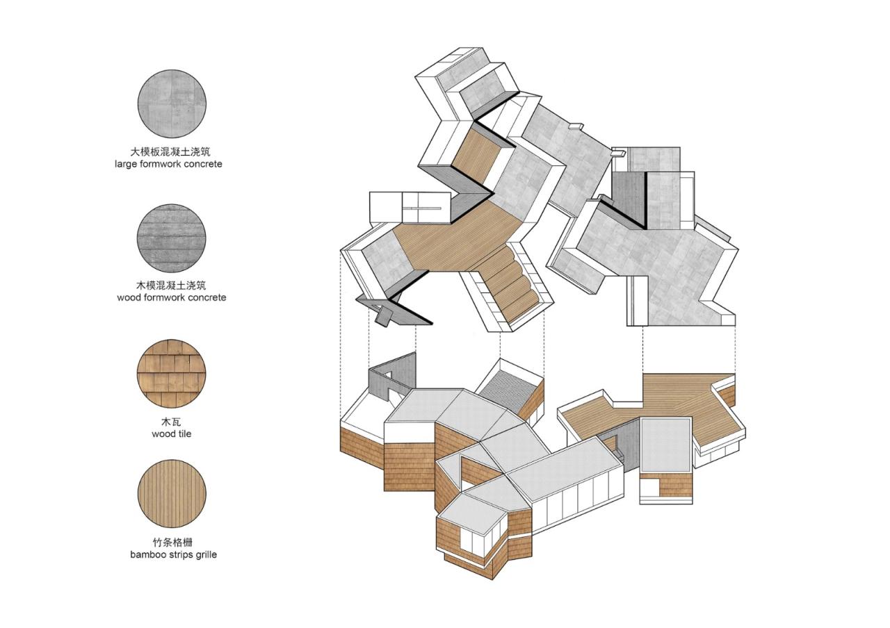 材料和氛围由于“混合社区”有面对不同人群的使用功能,所以各功能区域在材料语言和空间调性上也有所不同。展厅、咖啡厅、包括小书屋等对外的公共活动和文化功能部分在混凝土墙体的背景下大量使用了木瓦墙面和木工师傅现场制作的竹木门窗;改建部分的室外露台则采用密拼竹条作为遮阳和分隔;后院中新建的研学基地民宿则是一组带天井的白色小屋;这些地方性的材料给人们带来了温暖和熟悉的体验,同时其野生的气质也契合了项目所在的近郊乡村背景环境。我们在室内的楼梯、空中连桥和屋顶露台区域,则使用了钢板和钢格栅构件,希望能够通过这些金属材料的使用,搭配室内空间中大量裸露的混凝土墙体和楼板,营造一种又轻盈又朴素的空间特征。