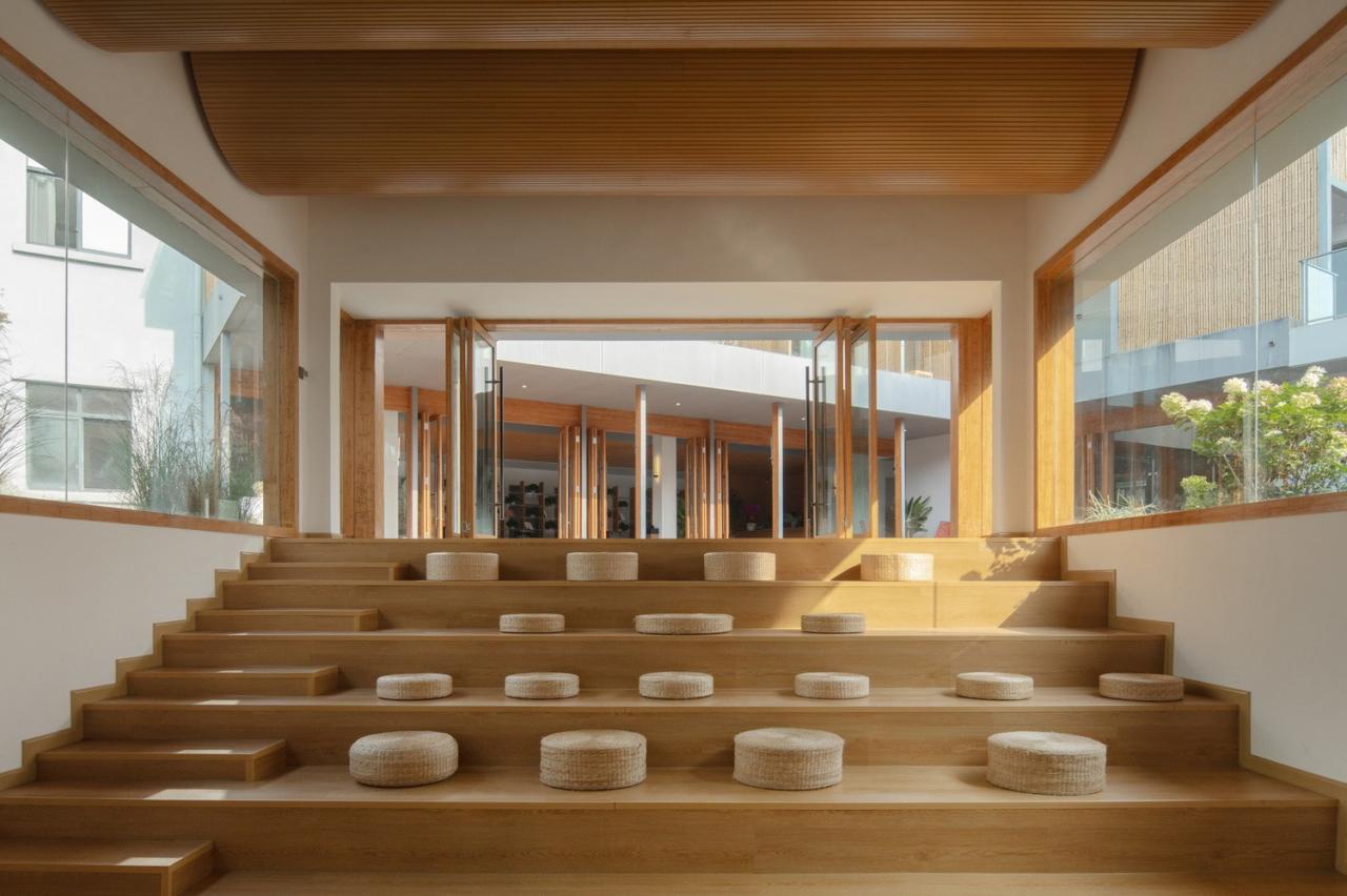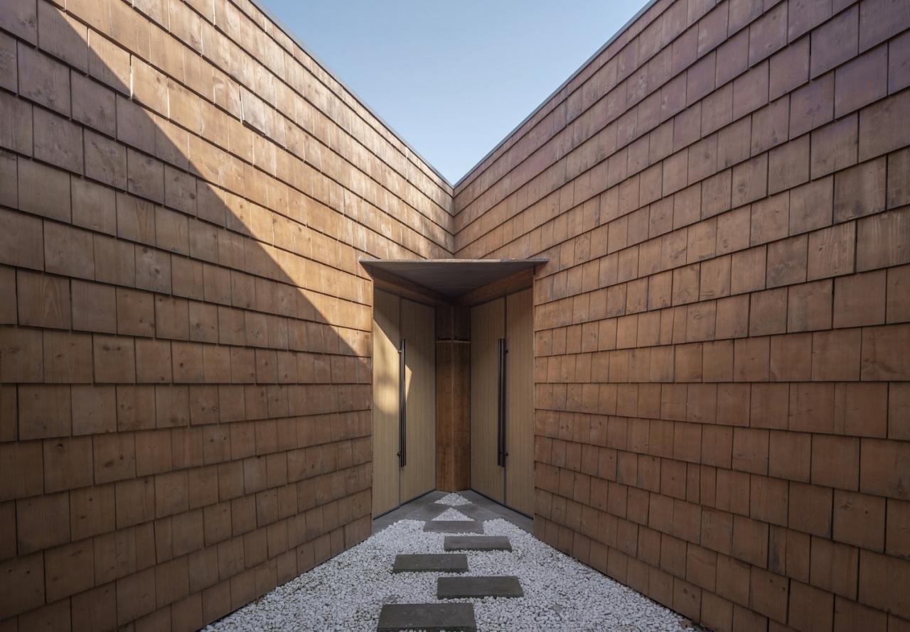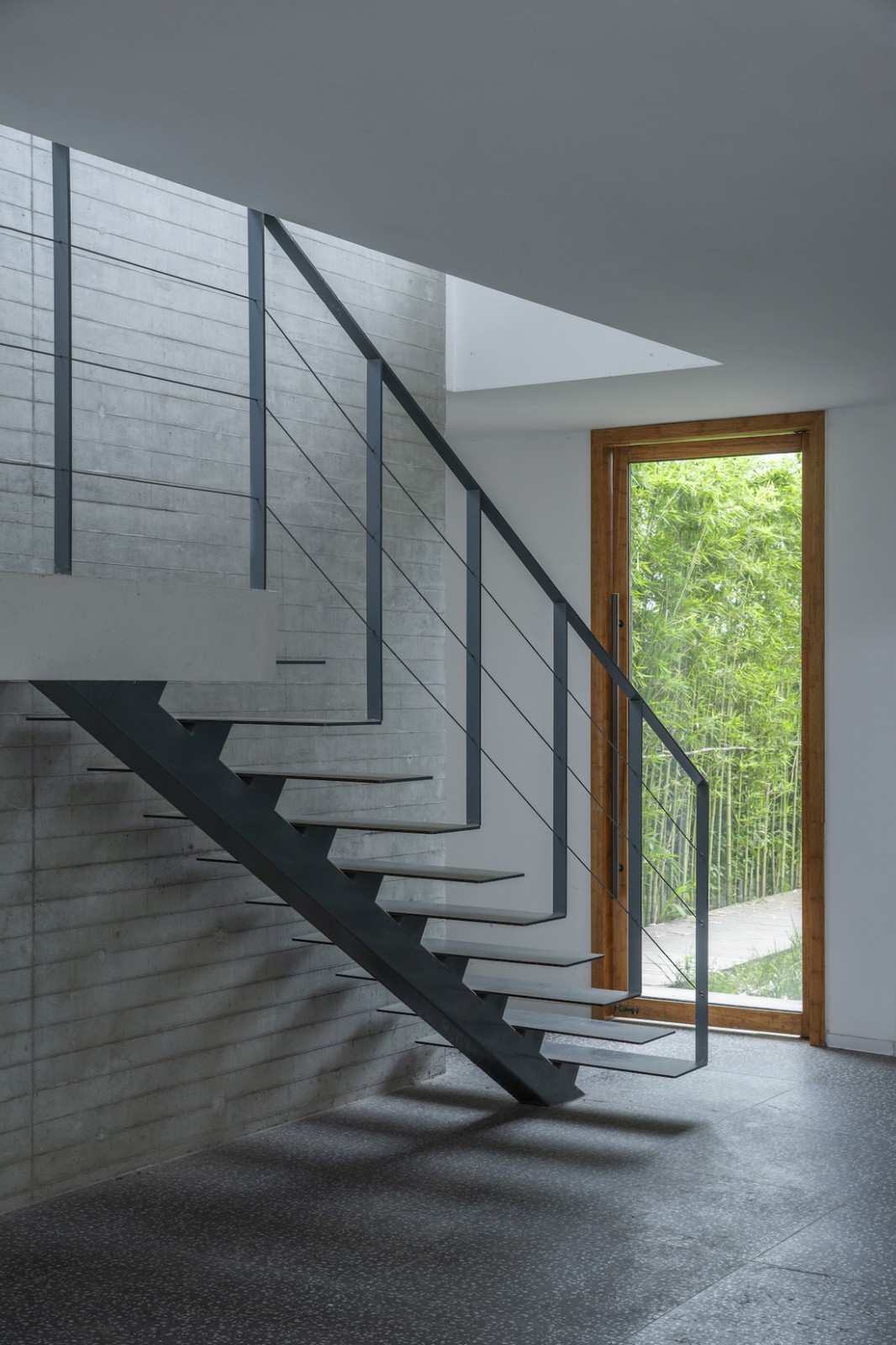 材料和氛围由于“混合社区”有面对不同人群的使用功能,所以各功能区域在材料语言和空间调性上也有所不同。展厅、咖啡厅、包括小书屋等对外的公共活动和文化功能部分在混凝土墙体的背景下大量使用了木瓦墙面和木工师傅现场制作的竹木门窗;改建部分的室外露台则采用密拼竹条作为遮阳和分隔;后院中新建的研学基地民宿则是一组带天井的白色小屋;这些地方性的材料给人们带来了温暖和熟悉的体验,同时其野生的气质也契合了项目所在的近郊乡村背景环境。我们在室内的楼梯、空中连桥和屋顶露台区域,则使用了钢板和钢格栅构件,希望能够通过这些金属材料的使用,搭配室内空间中大量裸露的混凝土墙体和楼板,营造一种又轻盈又朴素的空间特征。