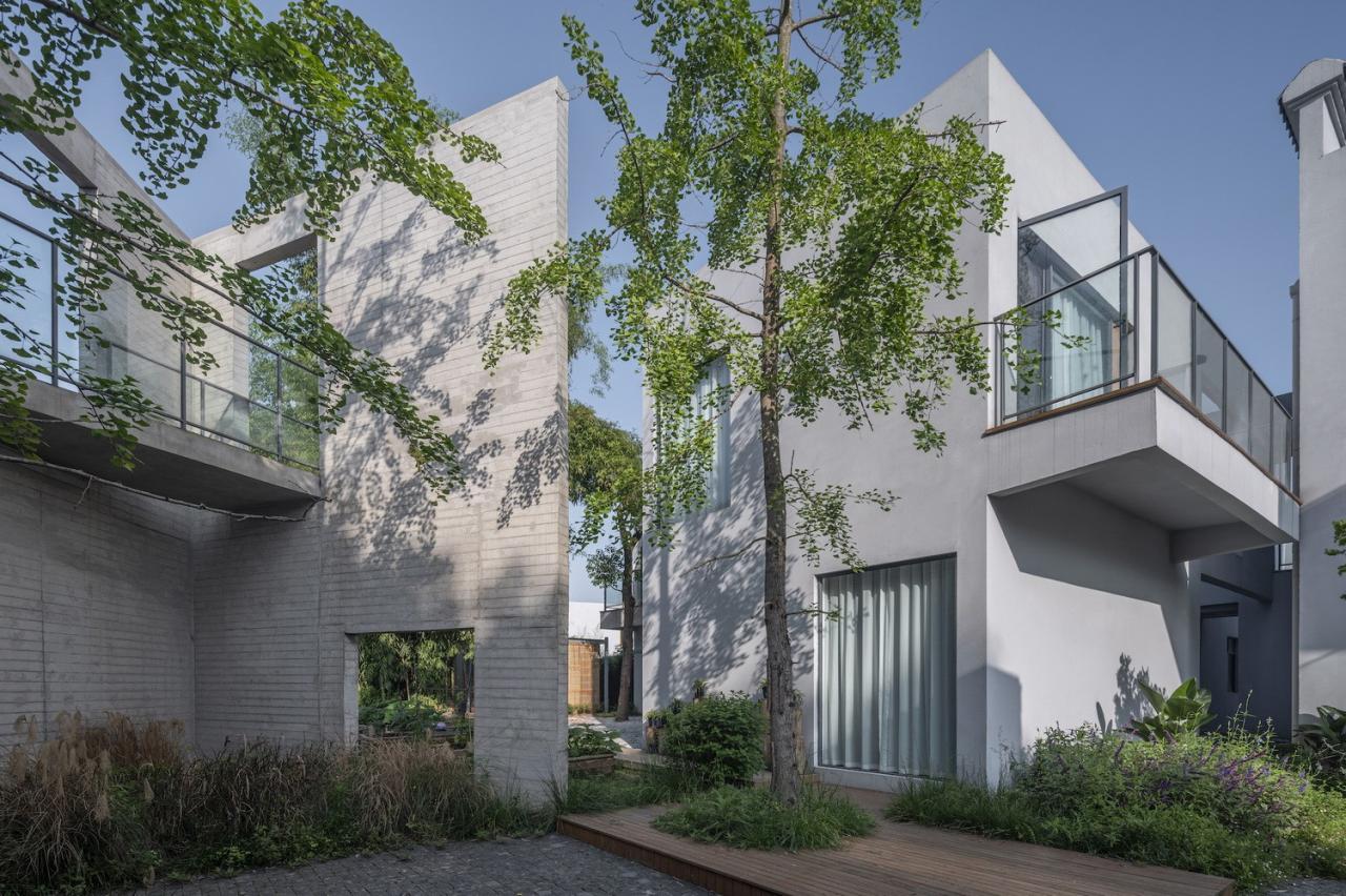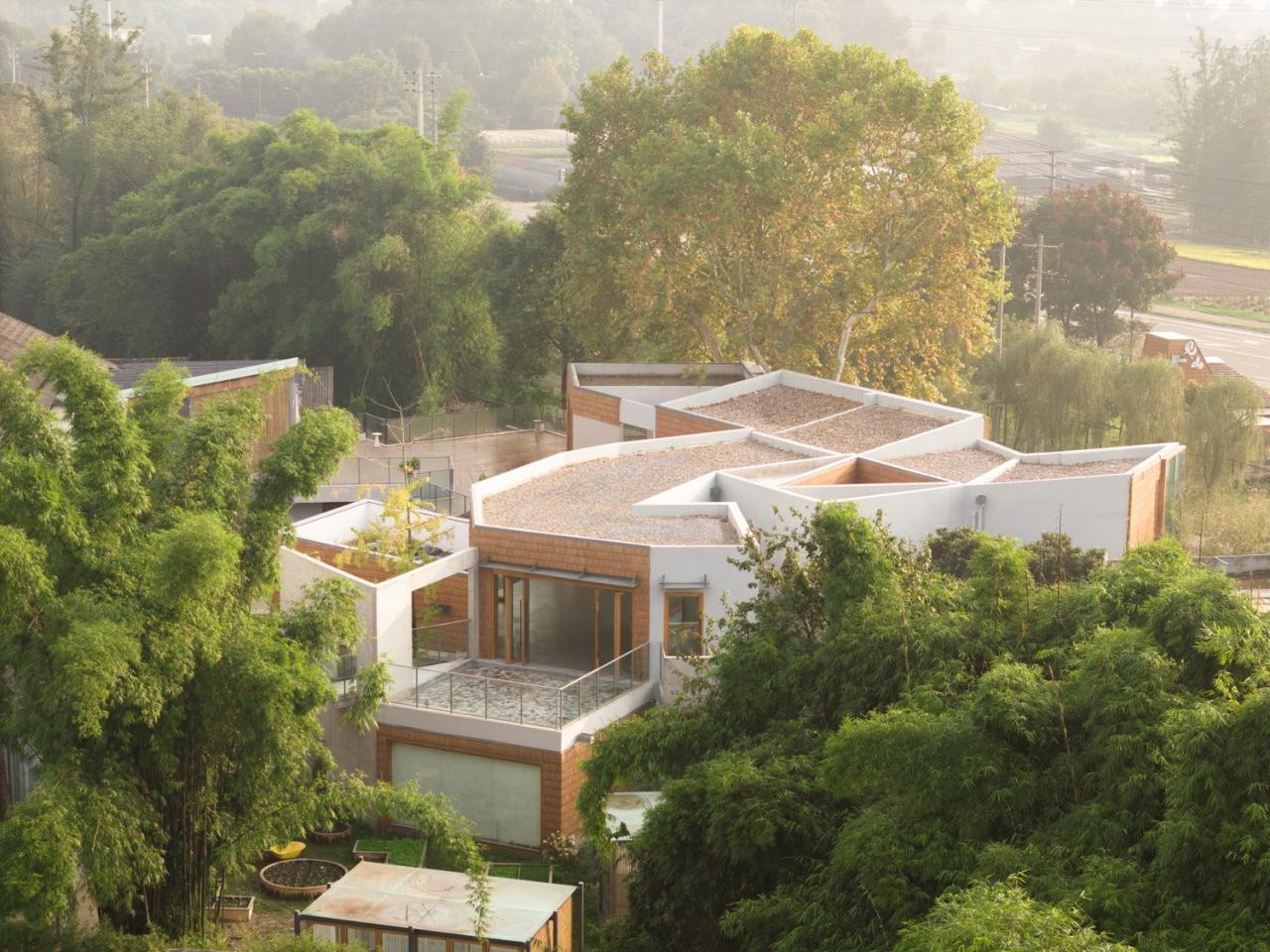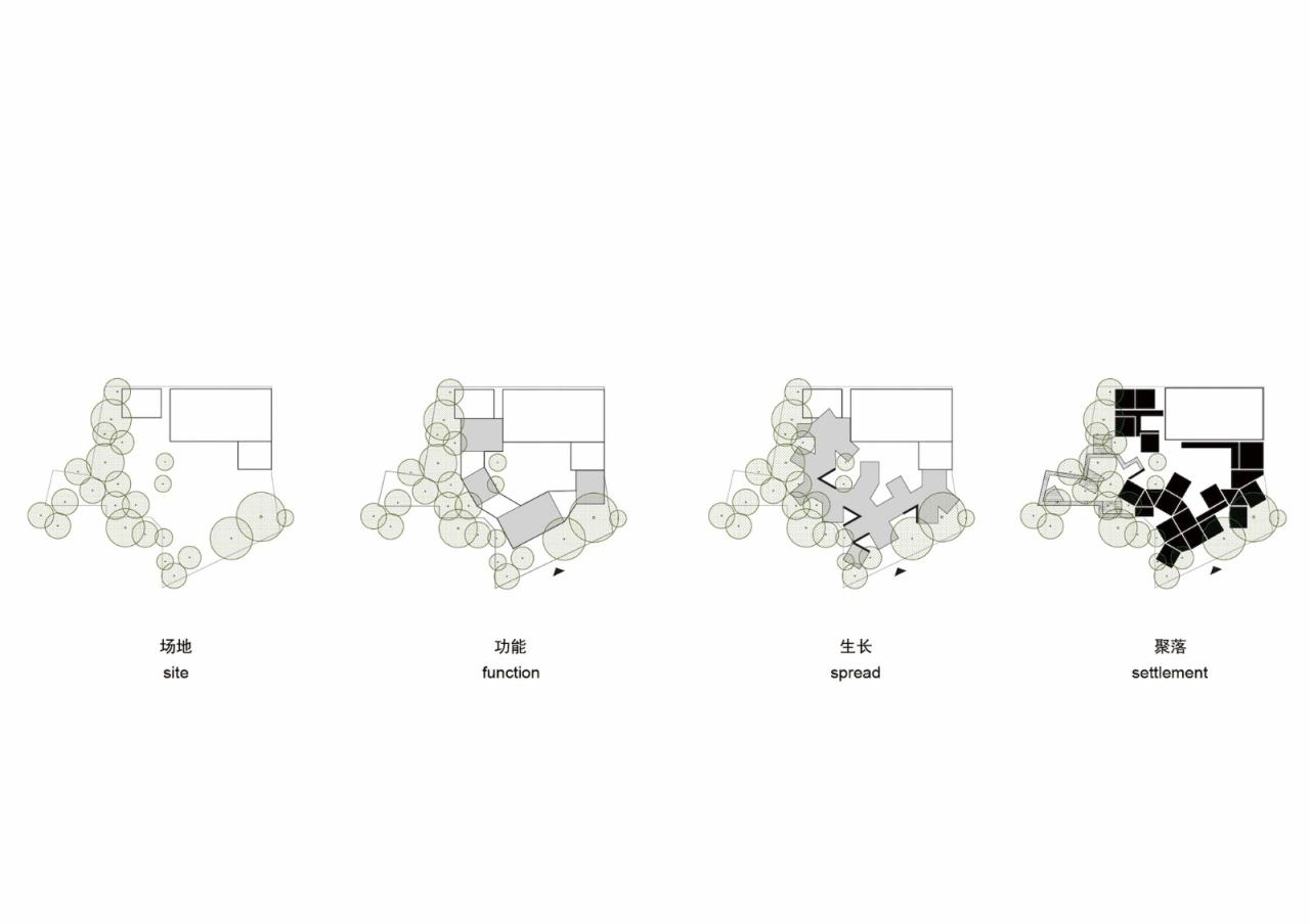 生长的聚落院子里原有一栋二层的办公楼,院门口几棵高大的梧桐树,以及西侧的竹林。为了契合乡村环境,我们采用小尺度聚落的概念进行构思,通过互相连接、避让树木的方式在院子里形成一个新的建筑群落,就好像是从原有建筑和竹林中生长出来一样。