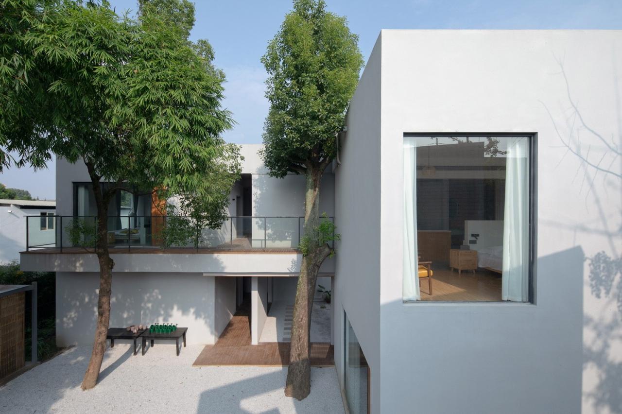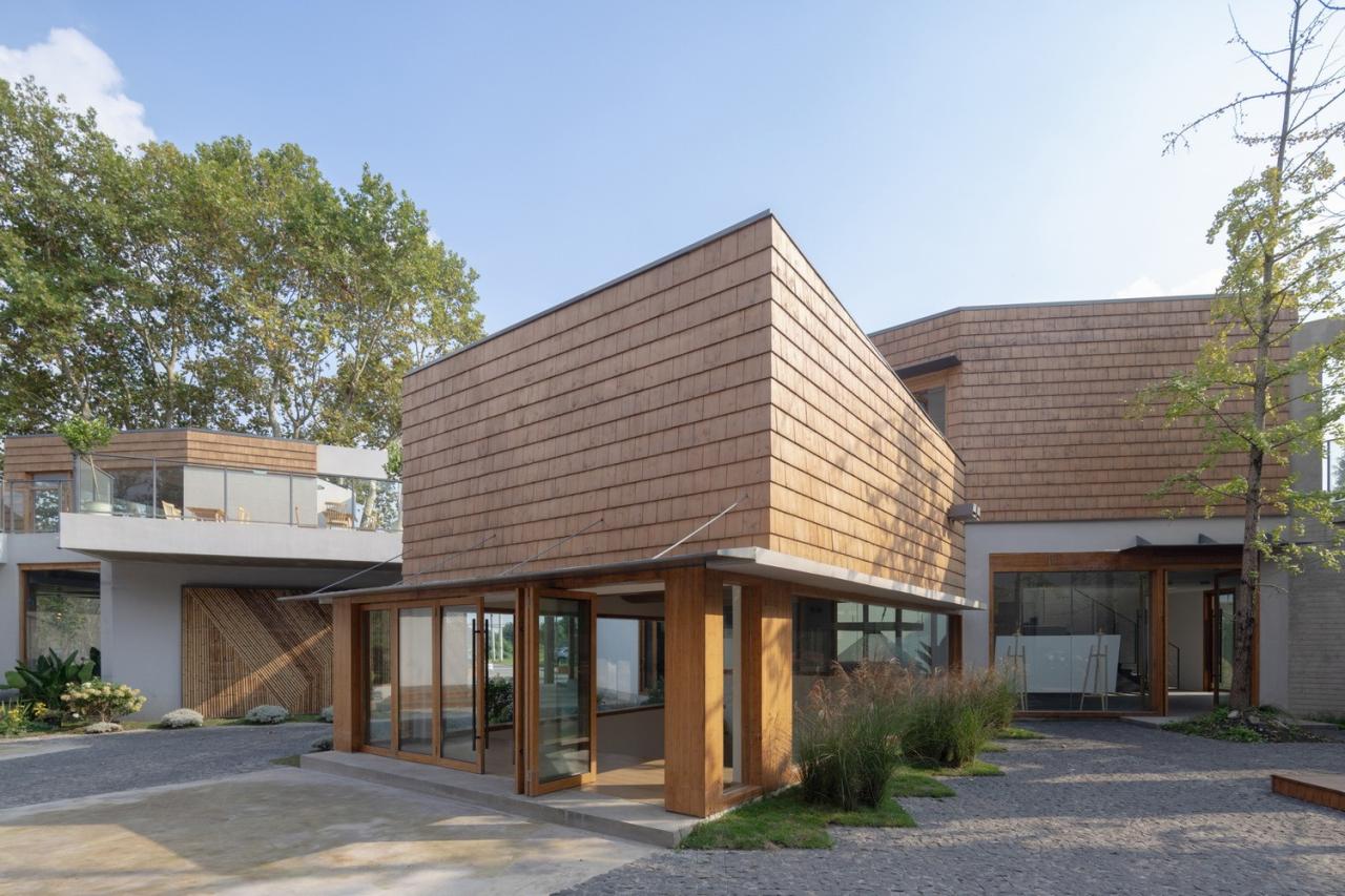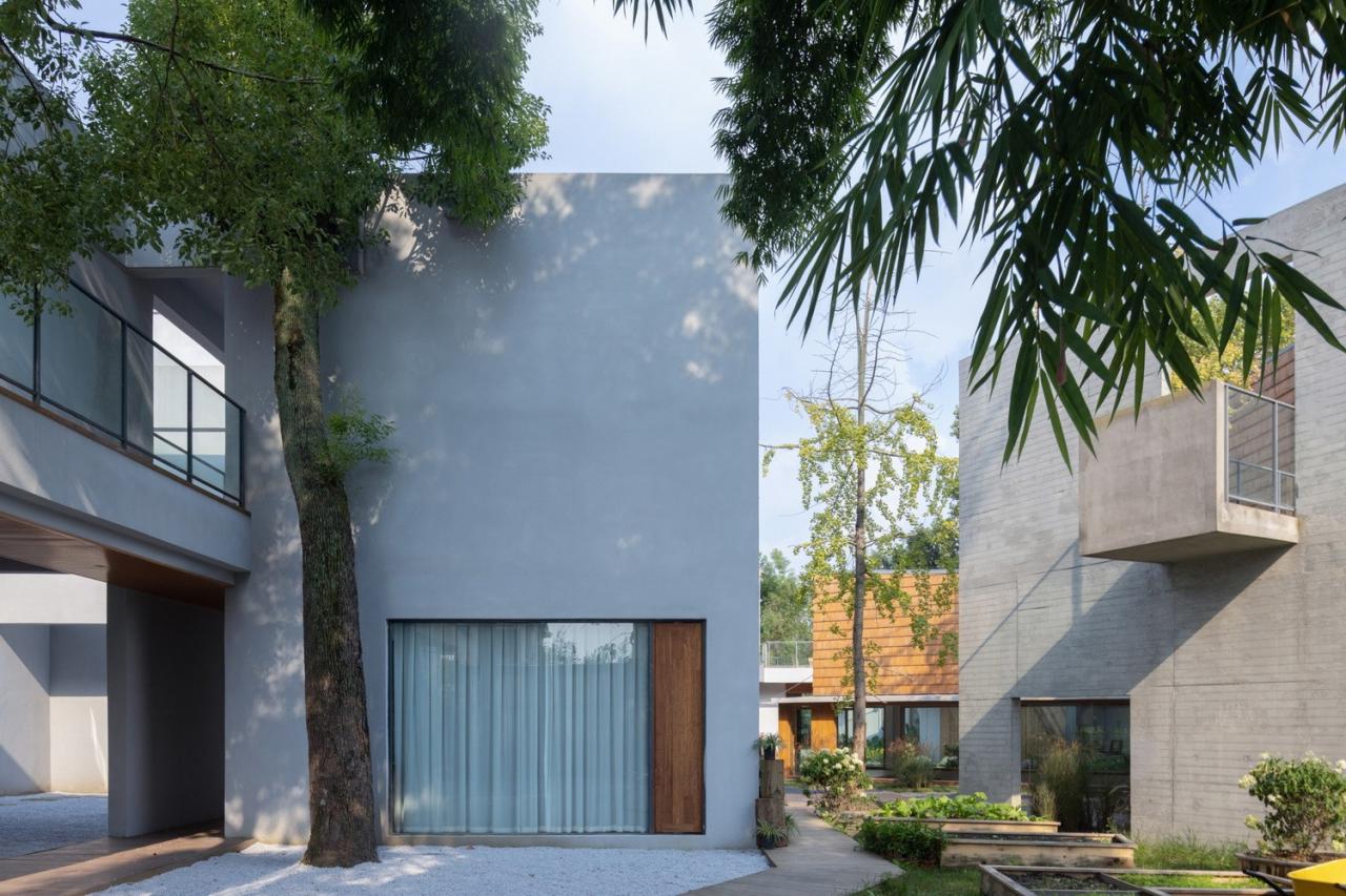 生长的聚落院子里原有一栋二层的办公楼,院门口几棵高大的梧桐树,以及西侧的竹林。为了契合乡村环境,我们采用小尺度聚落的概念进行构思,通过互相连接、避让树木的方式在院子里形成一个新的建筑群落,就好像是从原有建筑和竹林中生长出来一样。