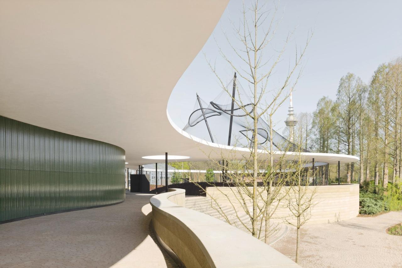 这个长约 120 米、宽达 30 米的弧形屋顶结构连接了建筑的多个功能区域。在南端,新的公园餐厅以热情邀请的姿态迎接到访的游客。用弧形玻璃幕墙围绕的就餐区可以俯瞰附近的 Kutzerweiher 池塘。在夏季,大型滑动门可以打开,让餐厅区域延伸到悬挑的遮阳篷下。