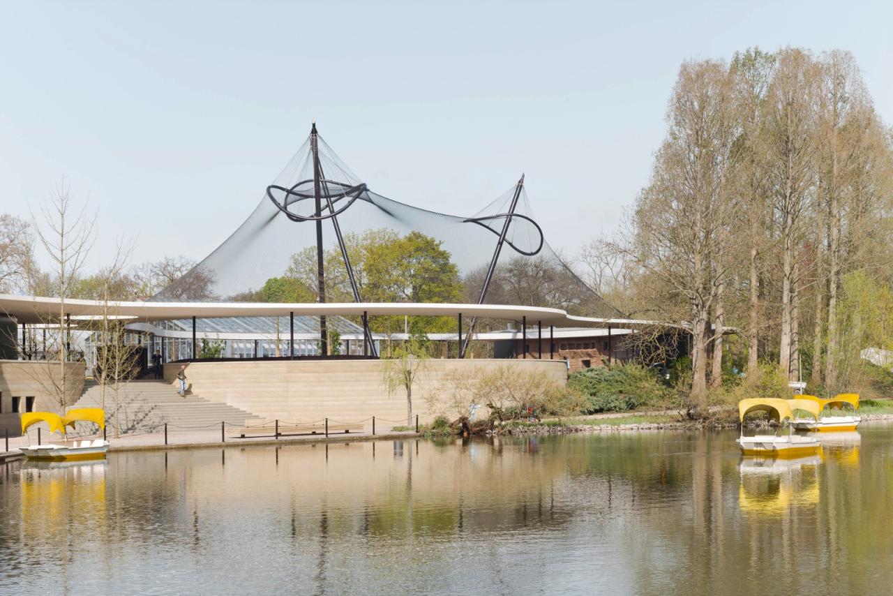 餐厅北侧毗邻一个可步行的自由飞行鸟舍,为此在屋顶板上开了一个 1,300 平方米的开口。鸟舍由 3 根支柱支撑的 18 米高的钢缆网结构覆盖。游客穿过鸟舍的路径会经过一个人工造景,其中包括一条水道和两个池塘。屋顶的北端是用于动物饲养和照料的建筑。