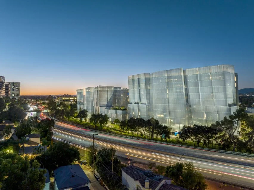 这些用于建筑面向高速公路的立面,具有“冰白色外观”,旨在唤起冰山的形状。在面向摄影棚的一侧,这些幕墙穿插着钢制外墙,窗户上有穿孔,模仿了早期好莱坞的装饰艺术风格建筑。