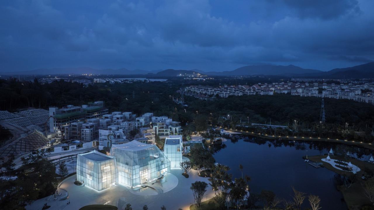 2024年,Wutopia Lab 设计的玉山岚峰:由三种穿孔率组合的半透明白色法拉利膜包裹的正大太阳河咖啡小镇艺术中心在海南万宁落成。在印尼归国华侨开拓的咖啡种植园上的艺术中心,以日夜交替的戏剧性视觉表达,成为当地一个象征奇迹和希望的文化地标。